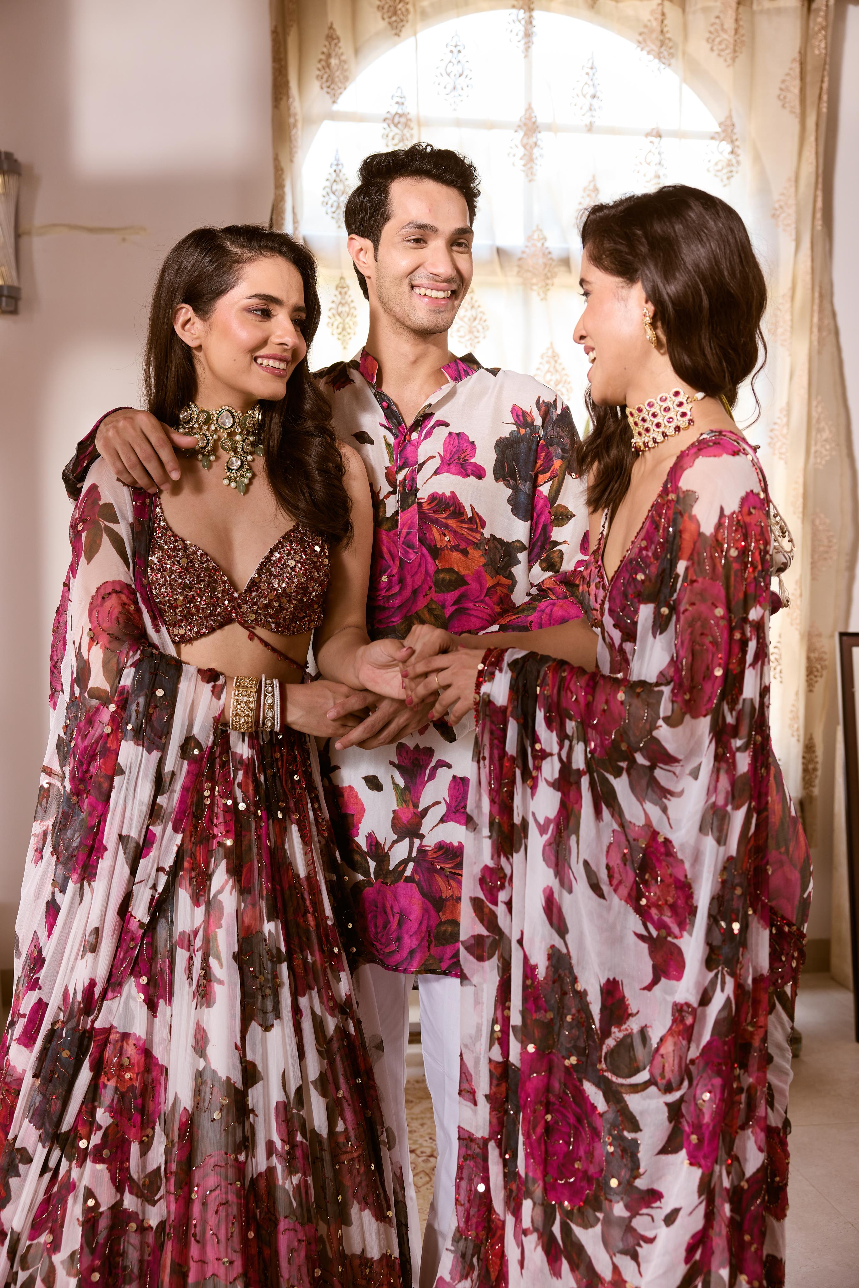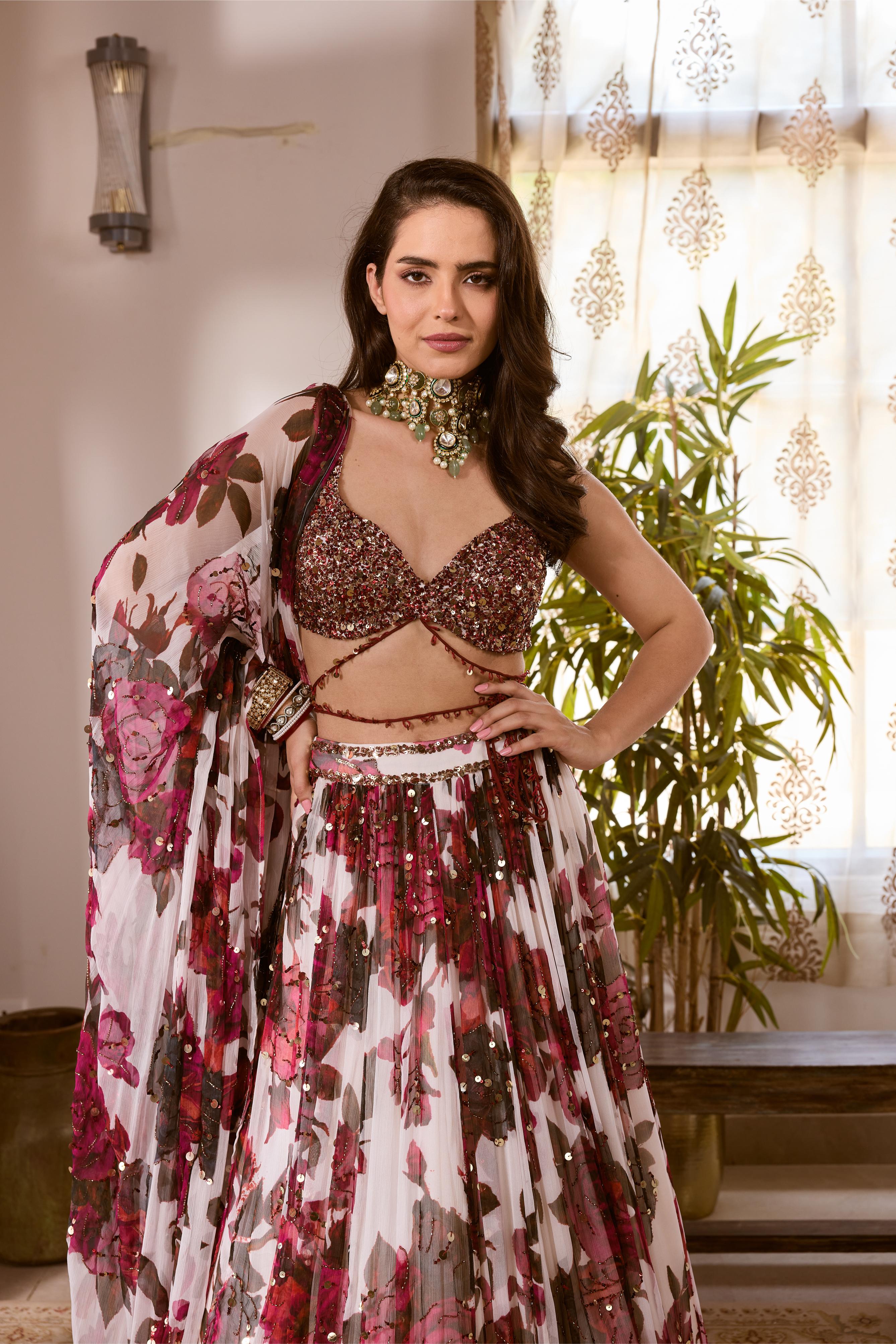 Featuring a White & Pink Floral Lehenga in Chiffon.