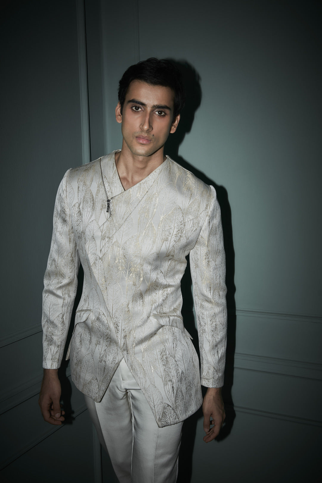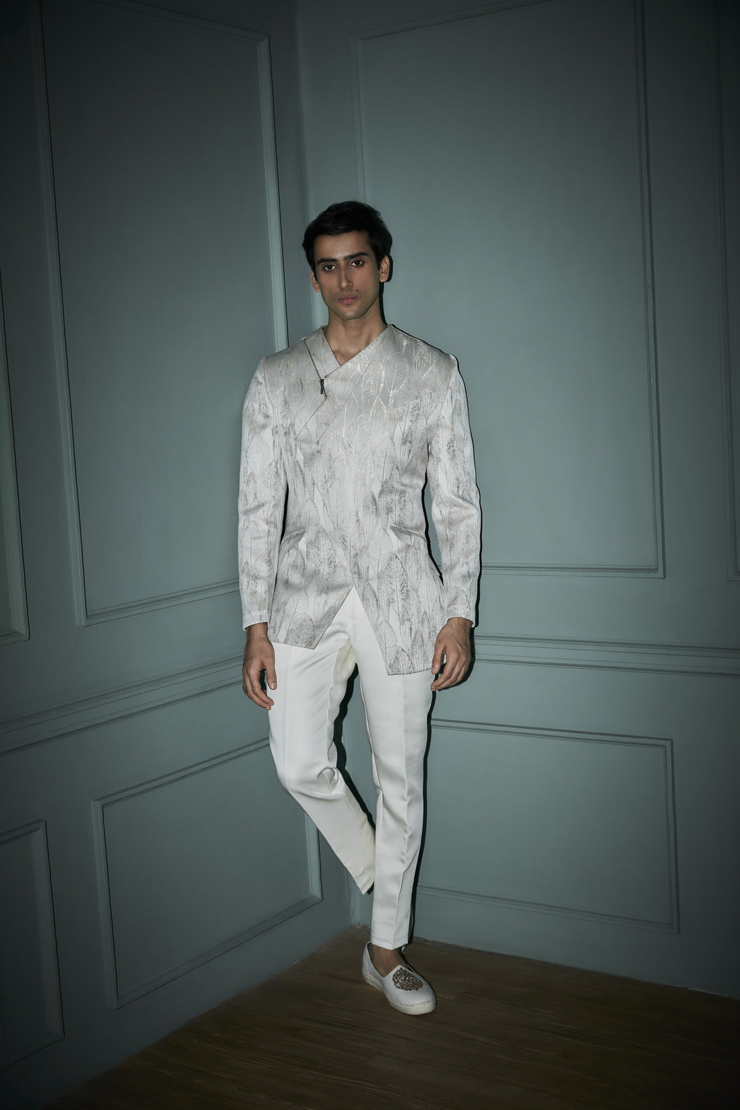 Exclusive jacket set tailored in a textured fabric. It comes with a matching pant making you look all dapper.