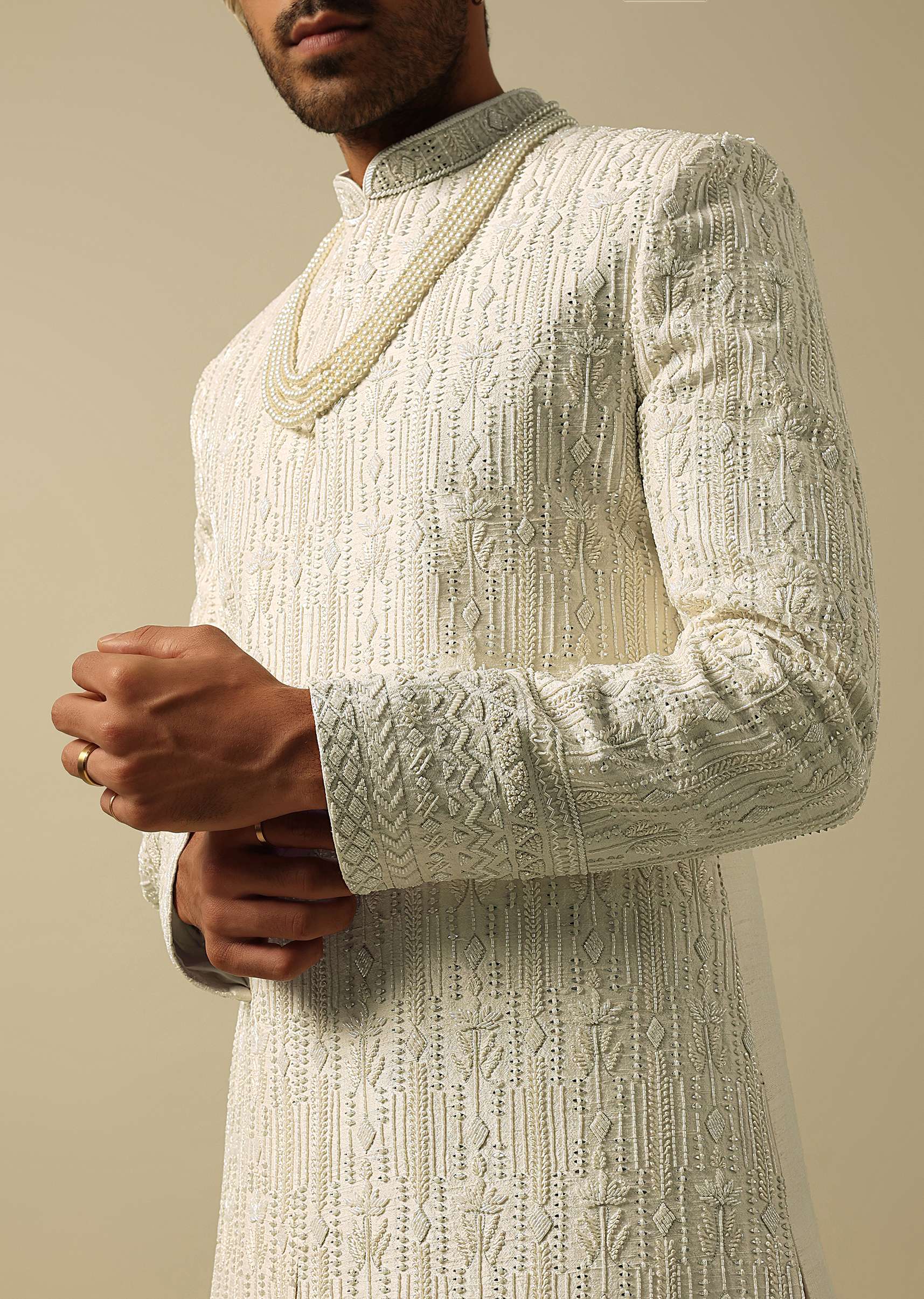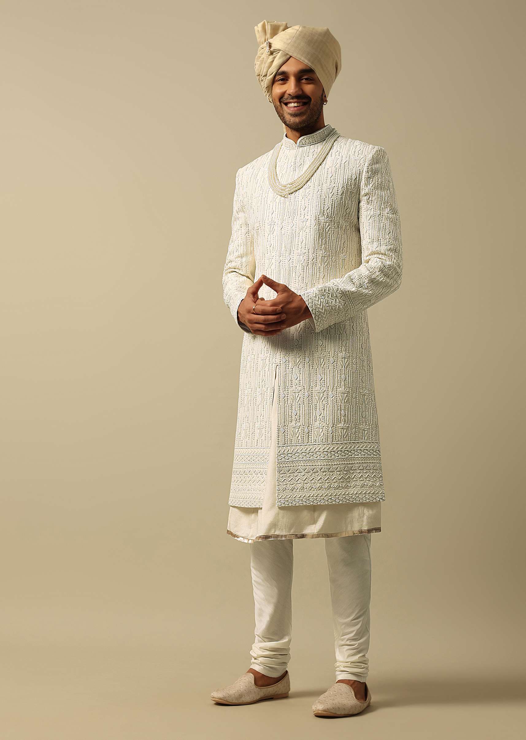 - Make a statement on your wedding day with our majestic White Raw Silk Sherwani.