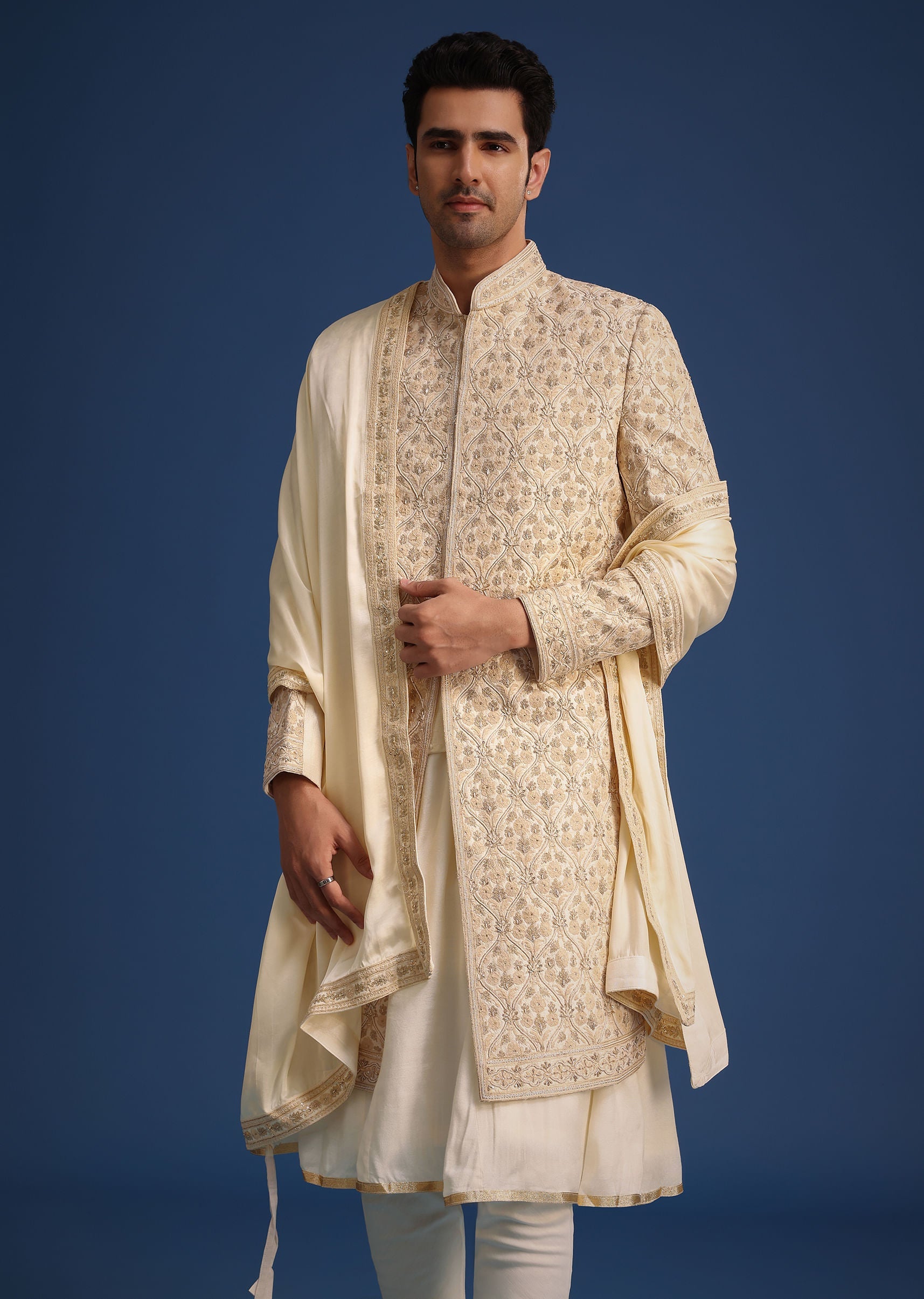 - Highlighted with a mandarin collar, front hook-eye placket and full sleeves, the sherwani is decked with zari work and zardozi embroidery.