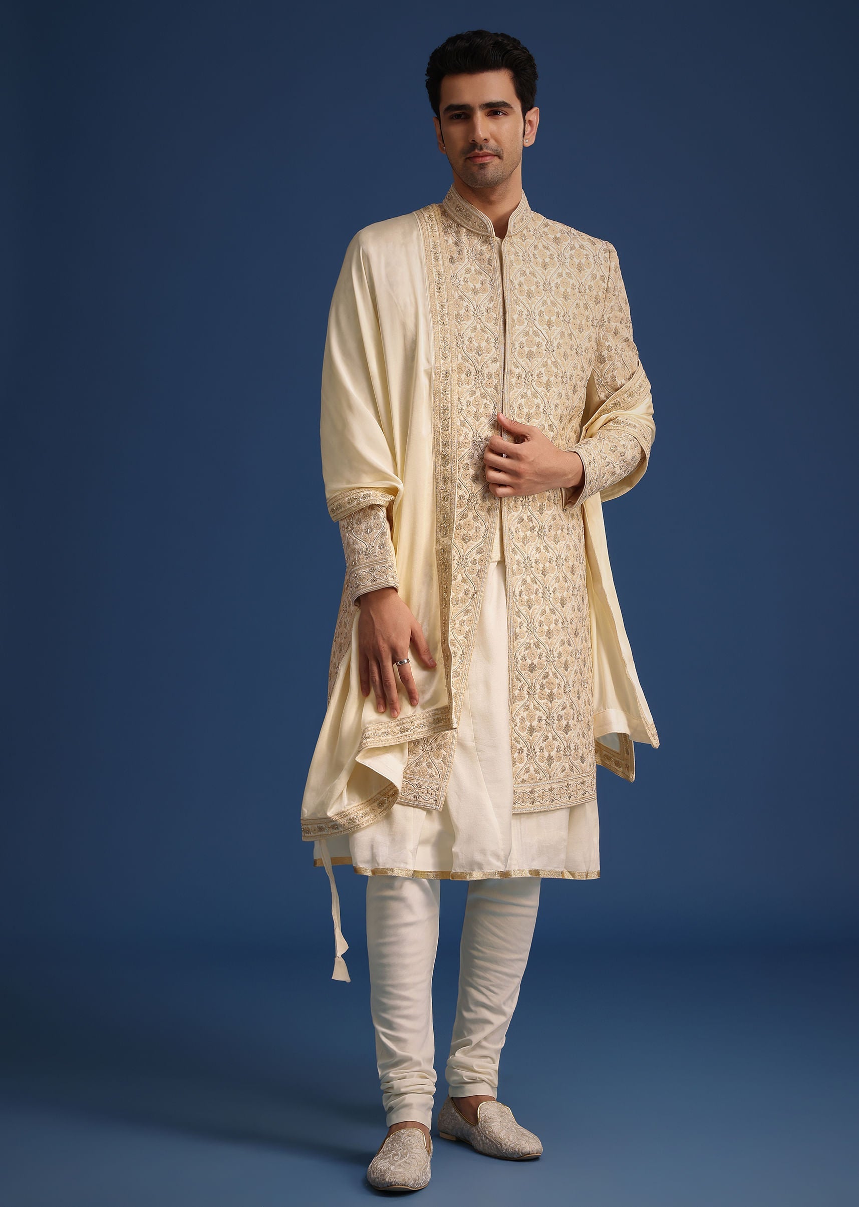 - Celebrate the season of festive celebrations and grand weddings in our opulent white silk sherwani set.