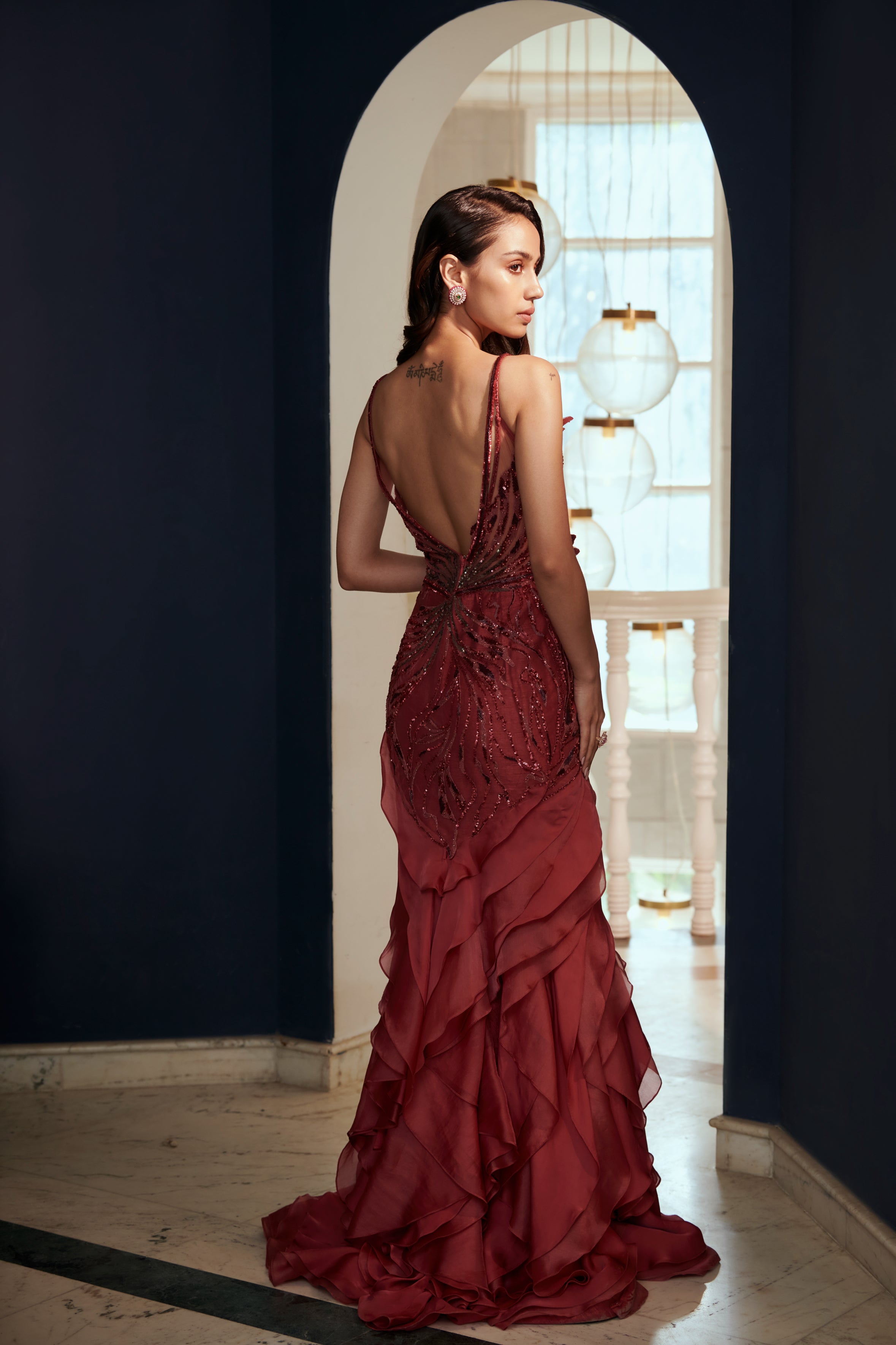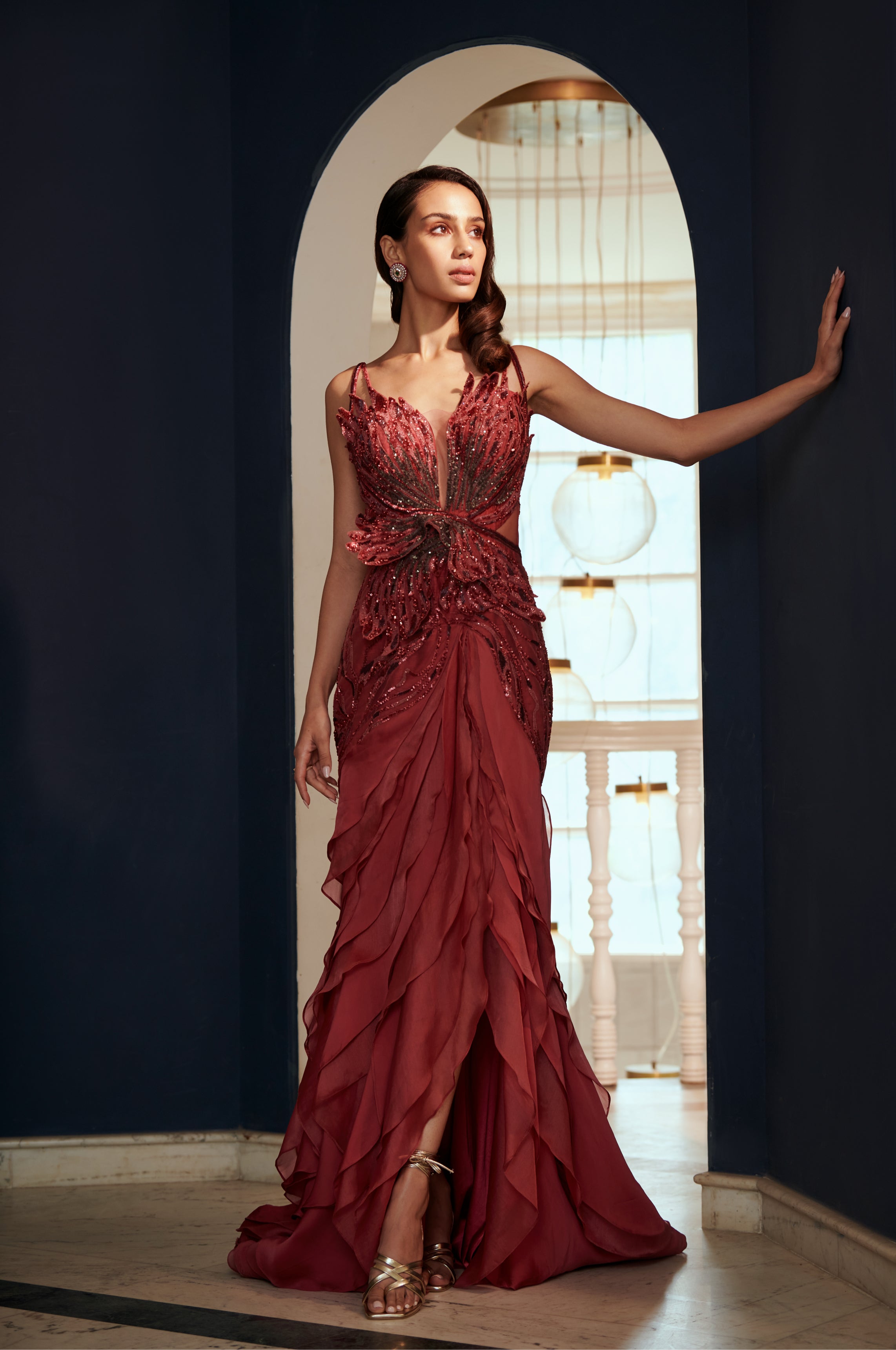 This gown comes with a body defined silhouette and handcrafted with sequins, cutdana, crystal and stones. The layers of organza are making it perfect attire for your special day.