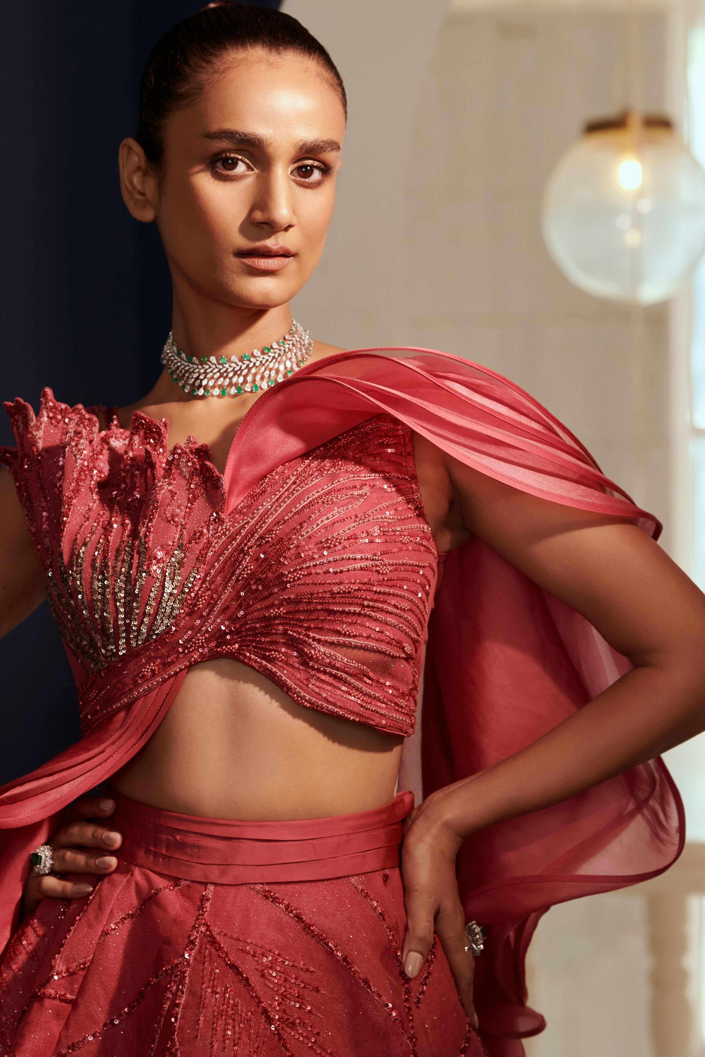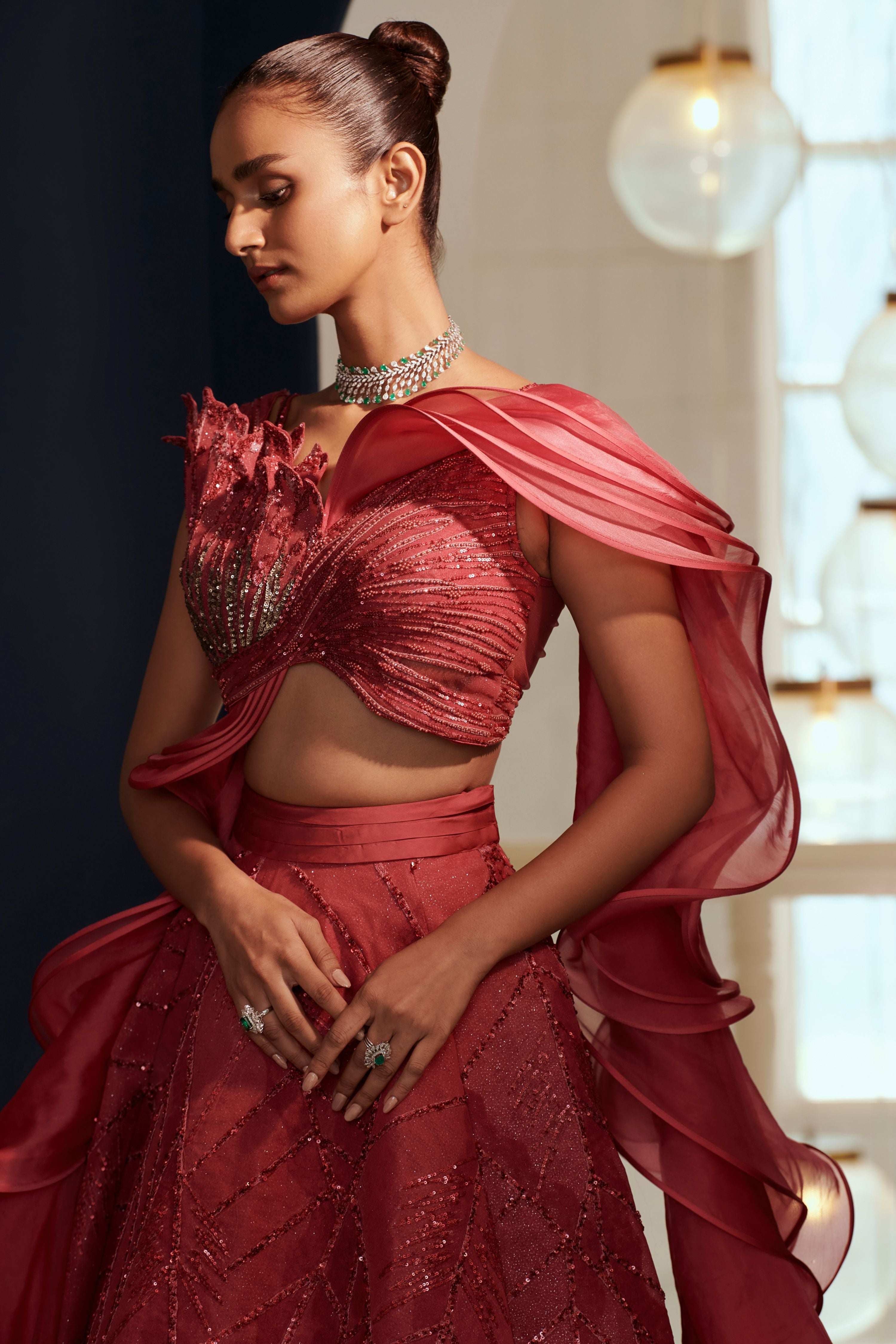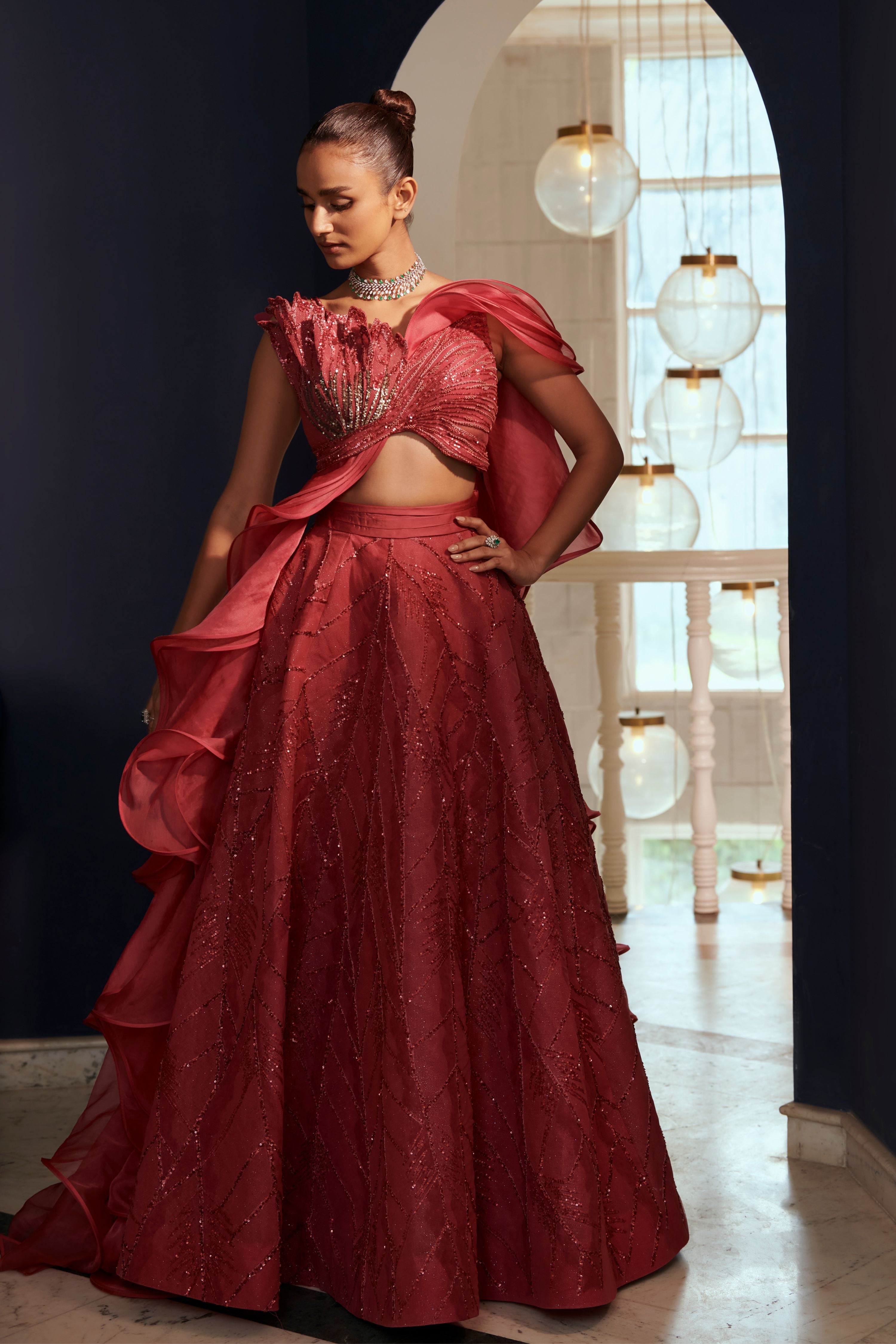 Adorned with Crystals, beads and sequins this mulberry colour skirt & top has the perfect fit silhouette for a cocktail ensemble. This comes with an attached flare dupatta.