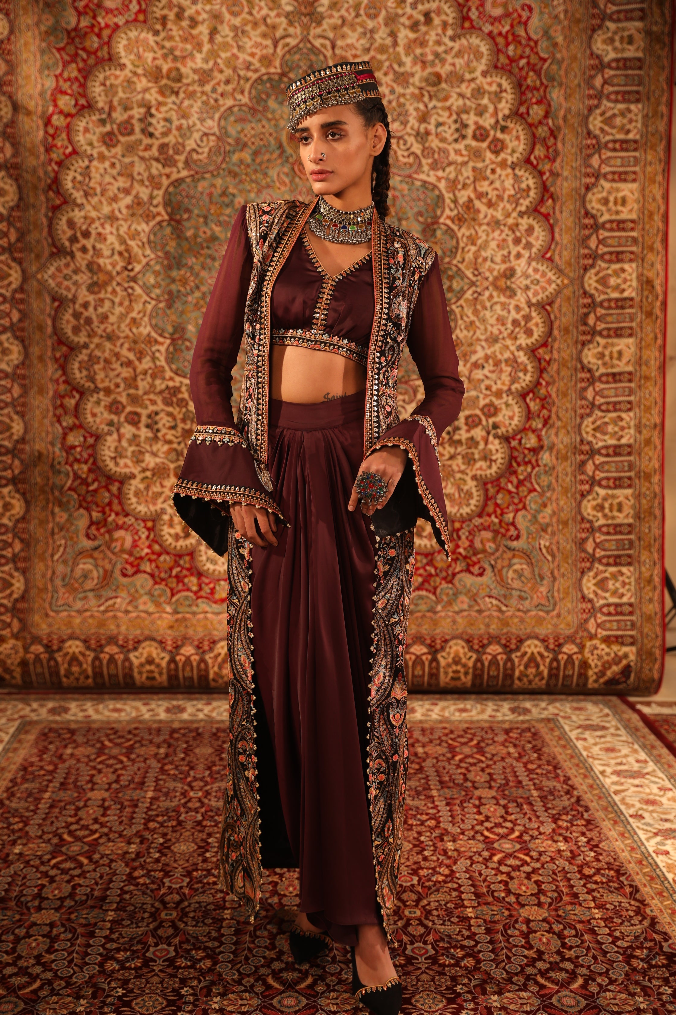 Jamawaar collection set with kashida embroidery features a V-neck blouse, a draped skirt and a full-sleeved, long jacket with triangular-cut panel towards the opening. The blouse has embroidery on neck line, waistline & CF, while the jacket has embroider applique across the body. The sleeves panel's edges also have embroidery on them. Tassels and small pearls border enhances the front body of the jacket and the sleeve hems.