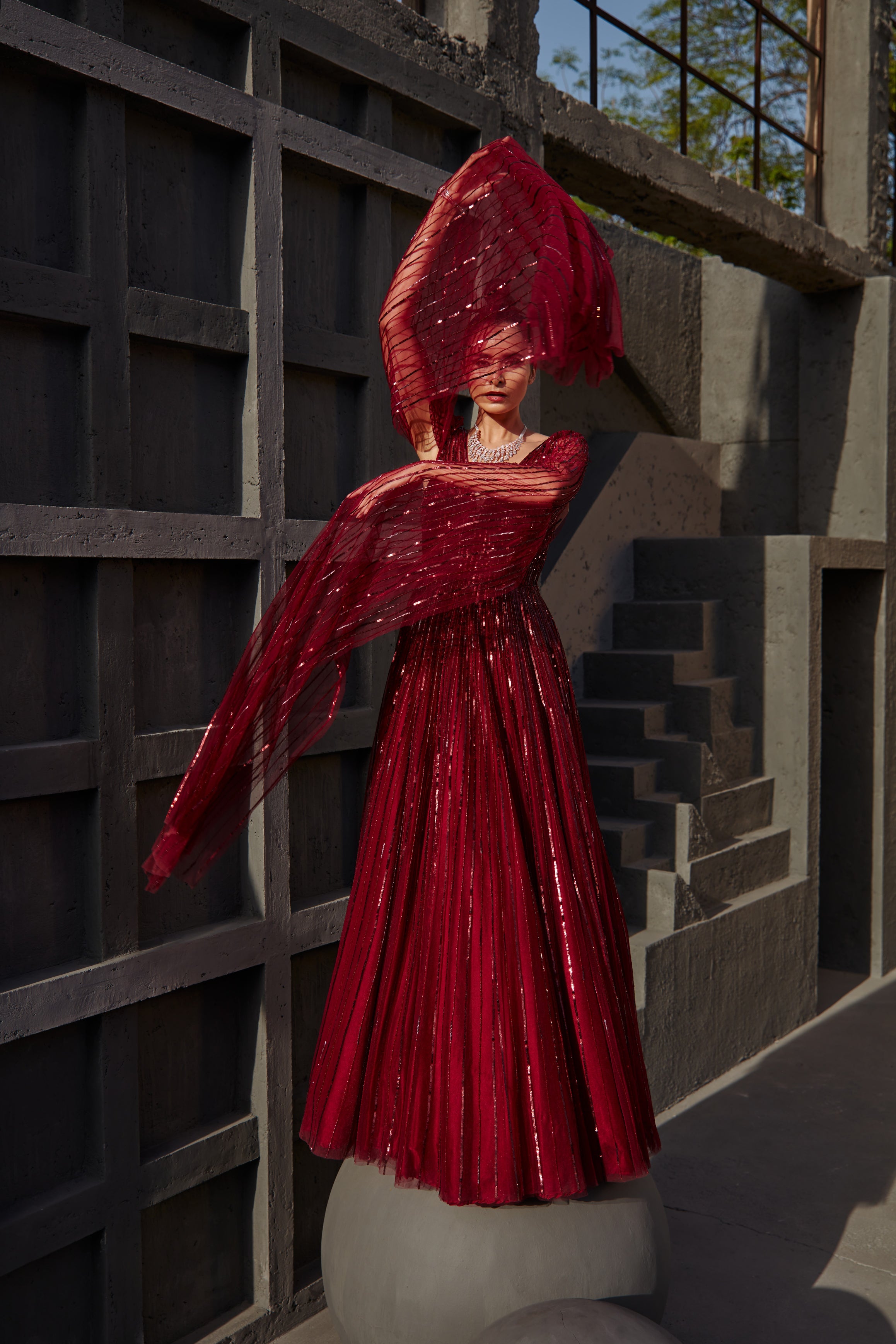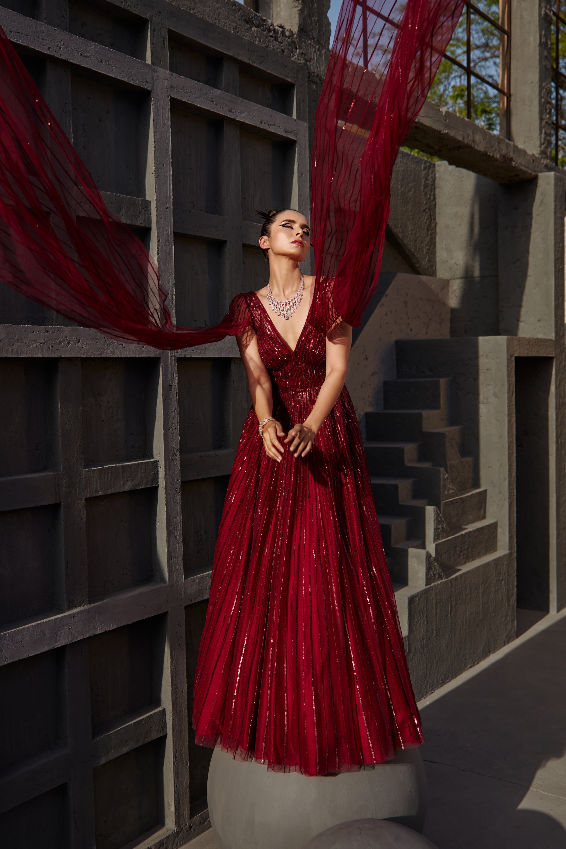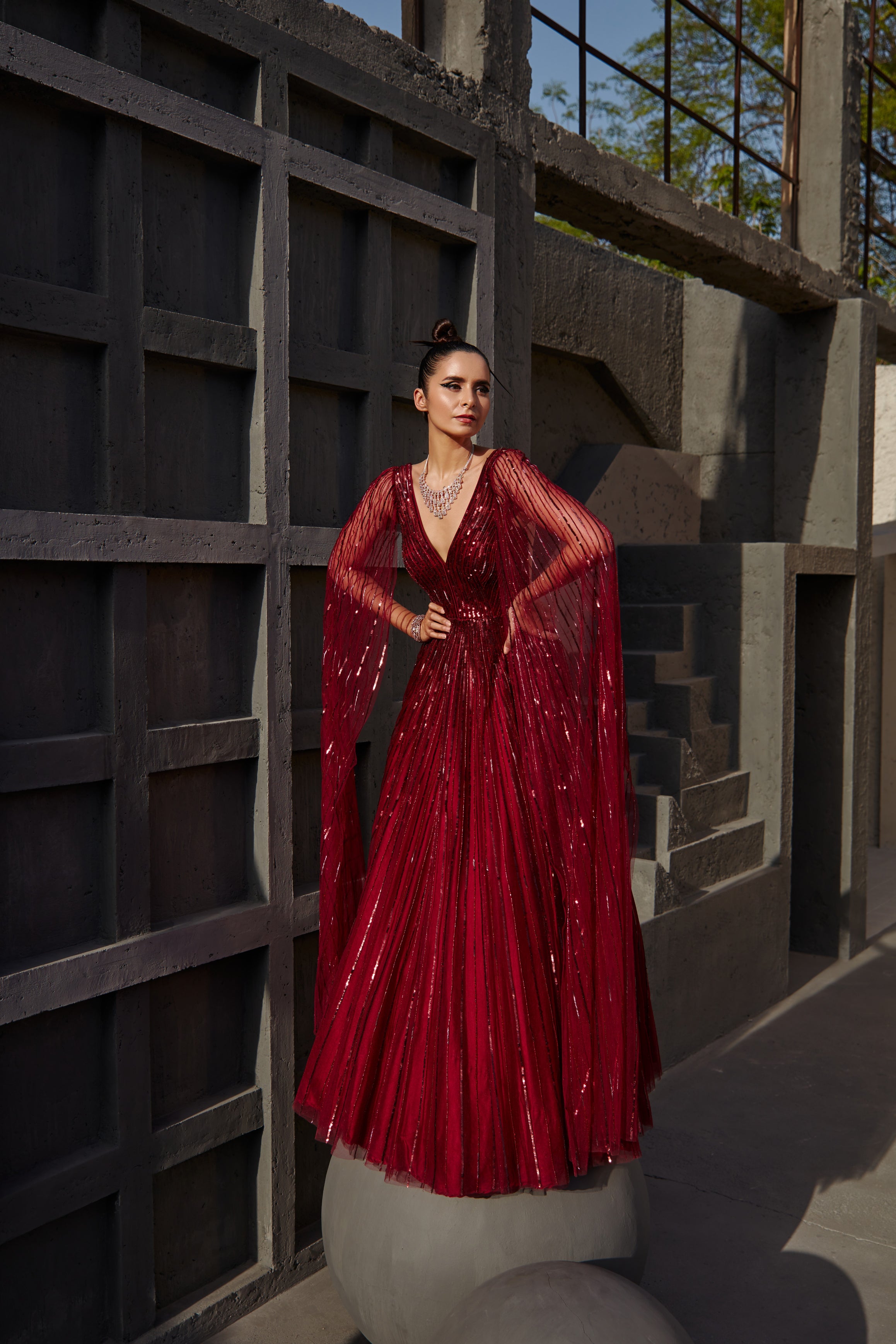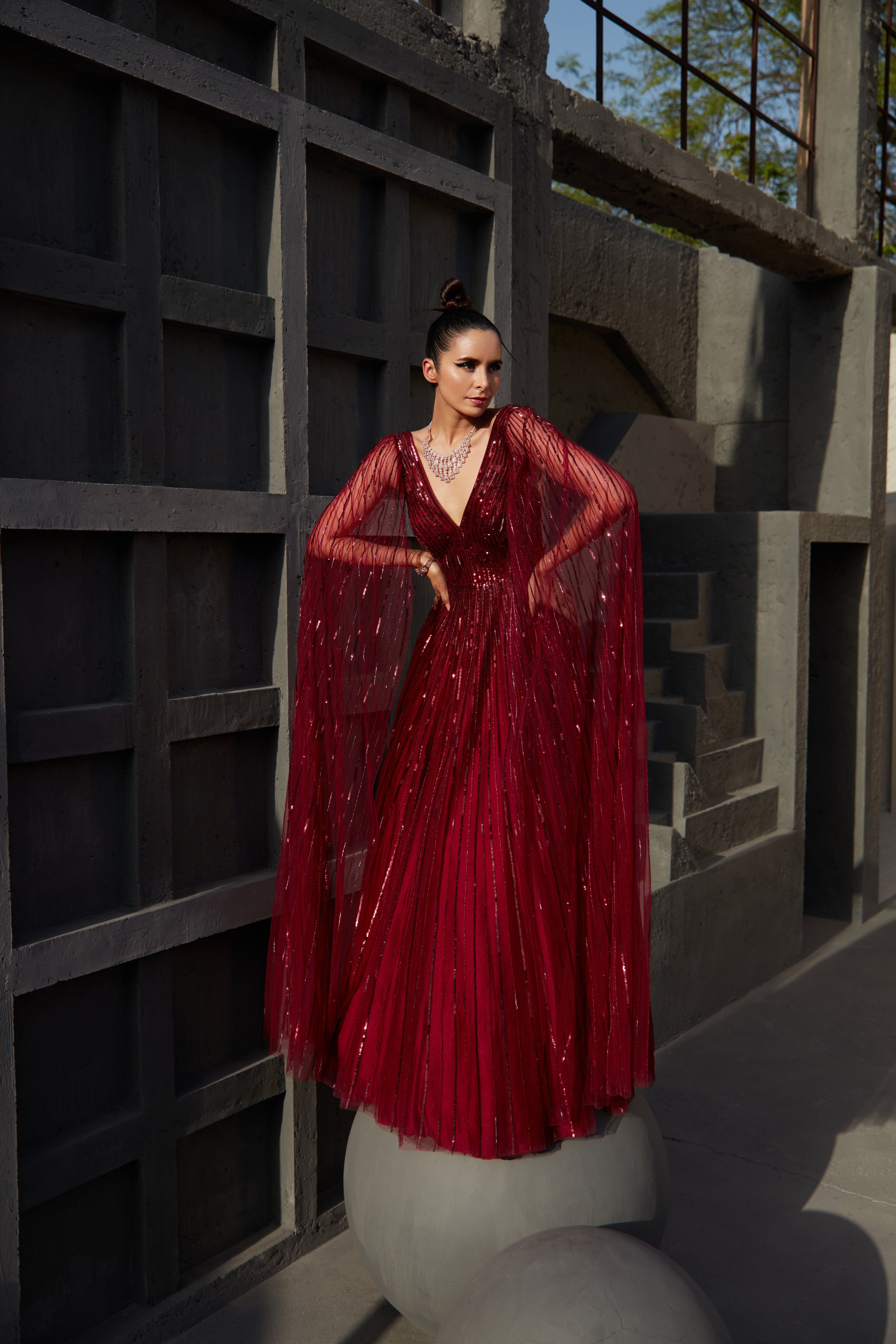 Featuring a wine sequined embellished gown with long cape sleeves.