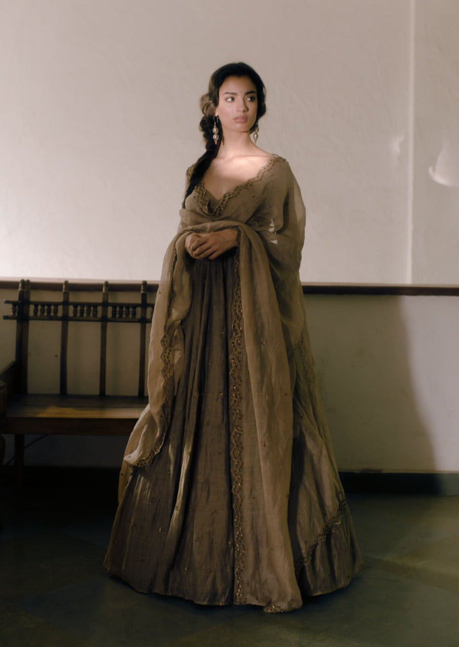 Featuring a BROWN ORGANDY ANARKALI SET IN ORGANDY.
