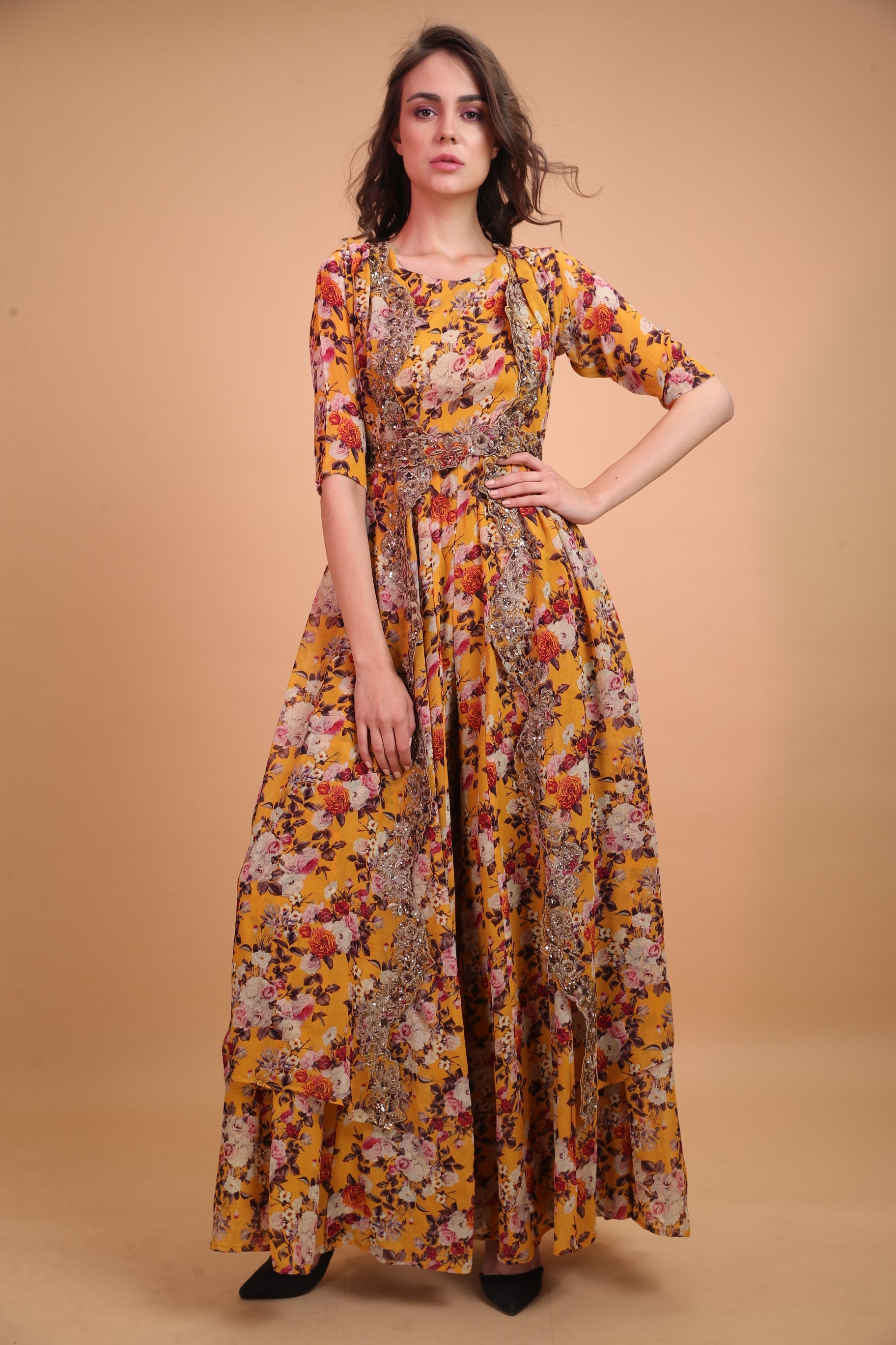 Featuring a MUSTARD FLORAL JUMPSUIT Set in GEORGETTE.