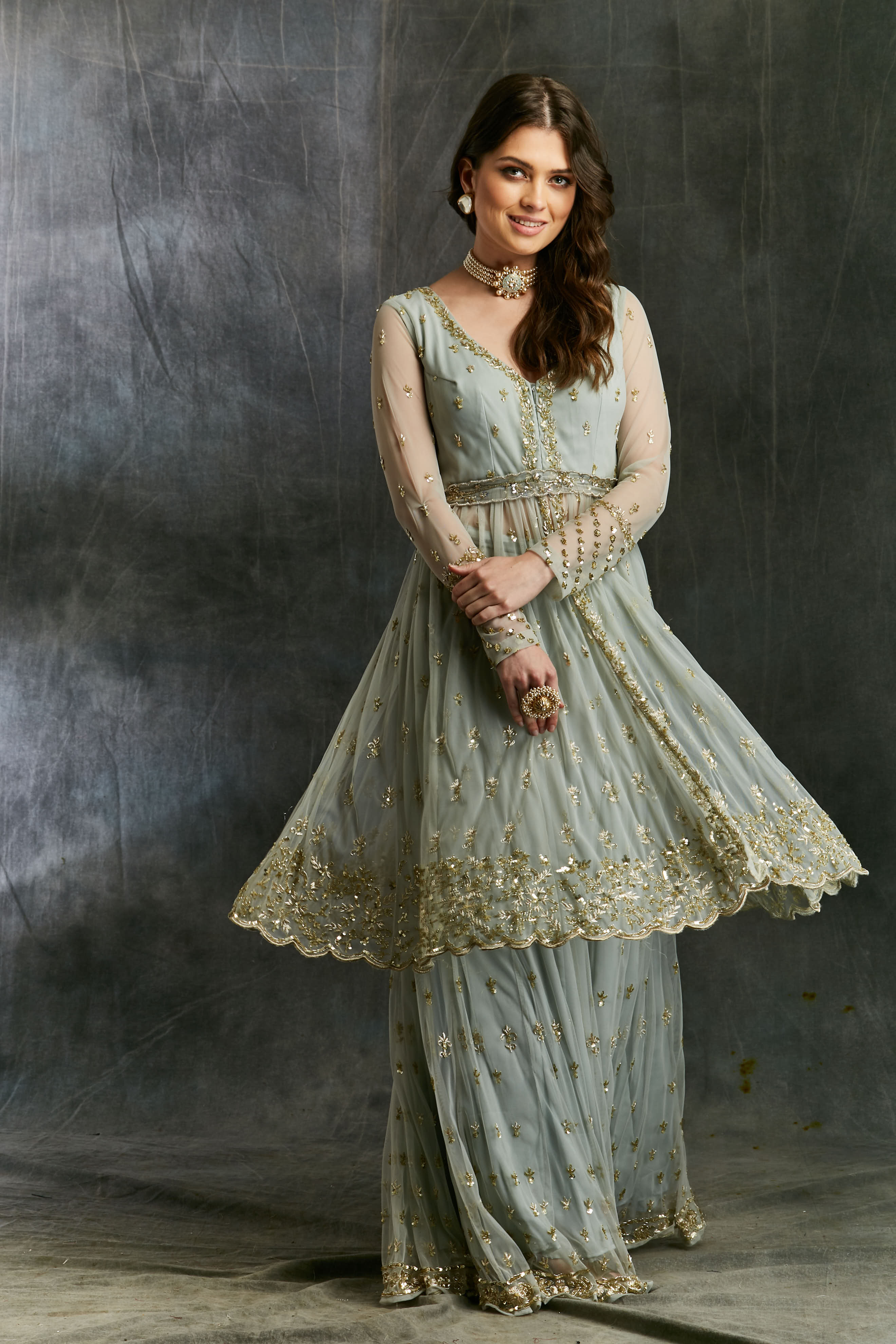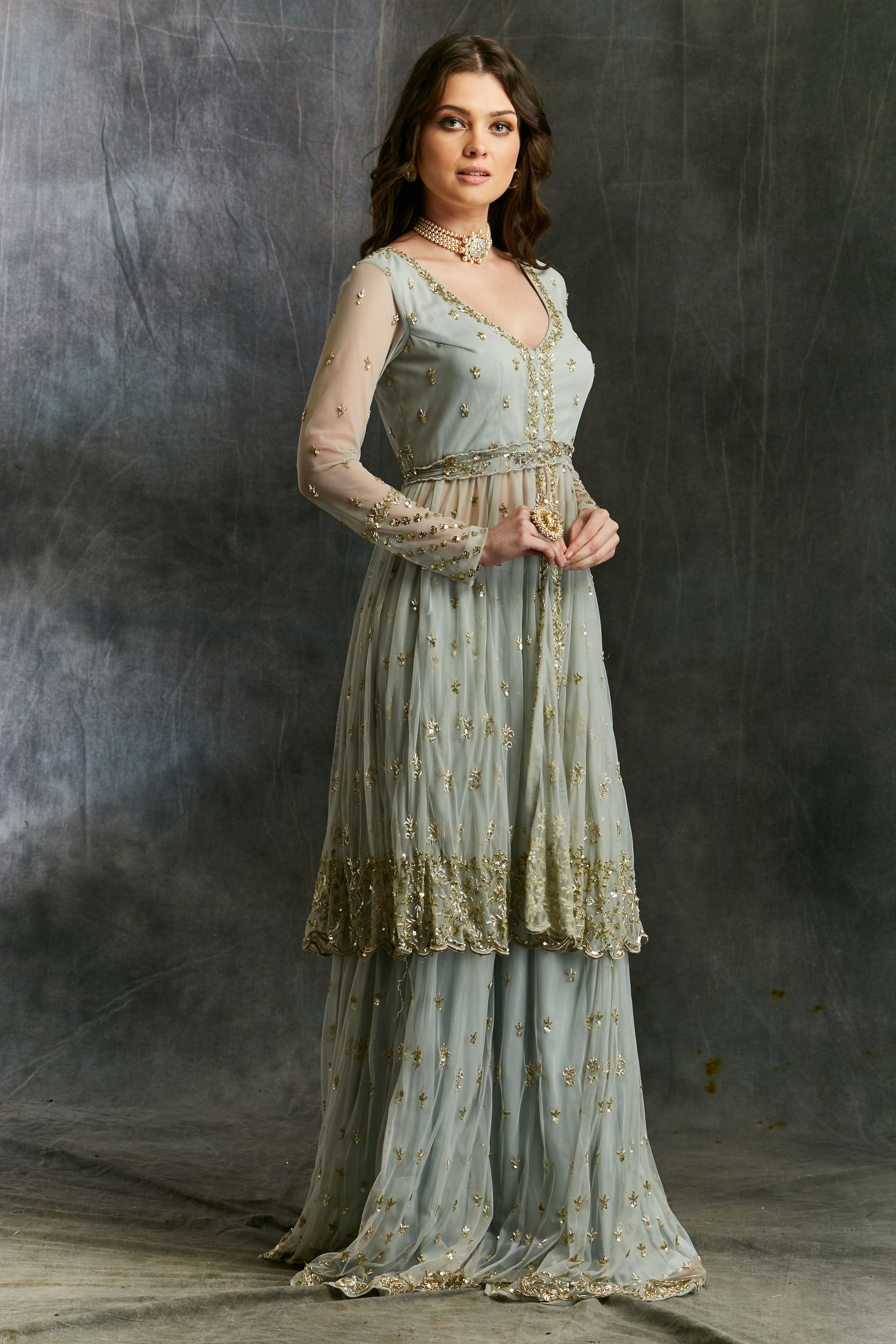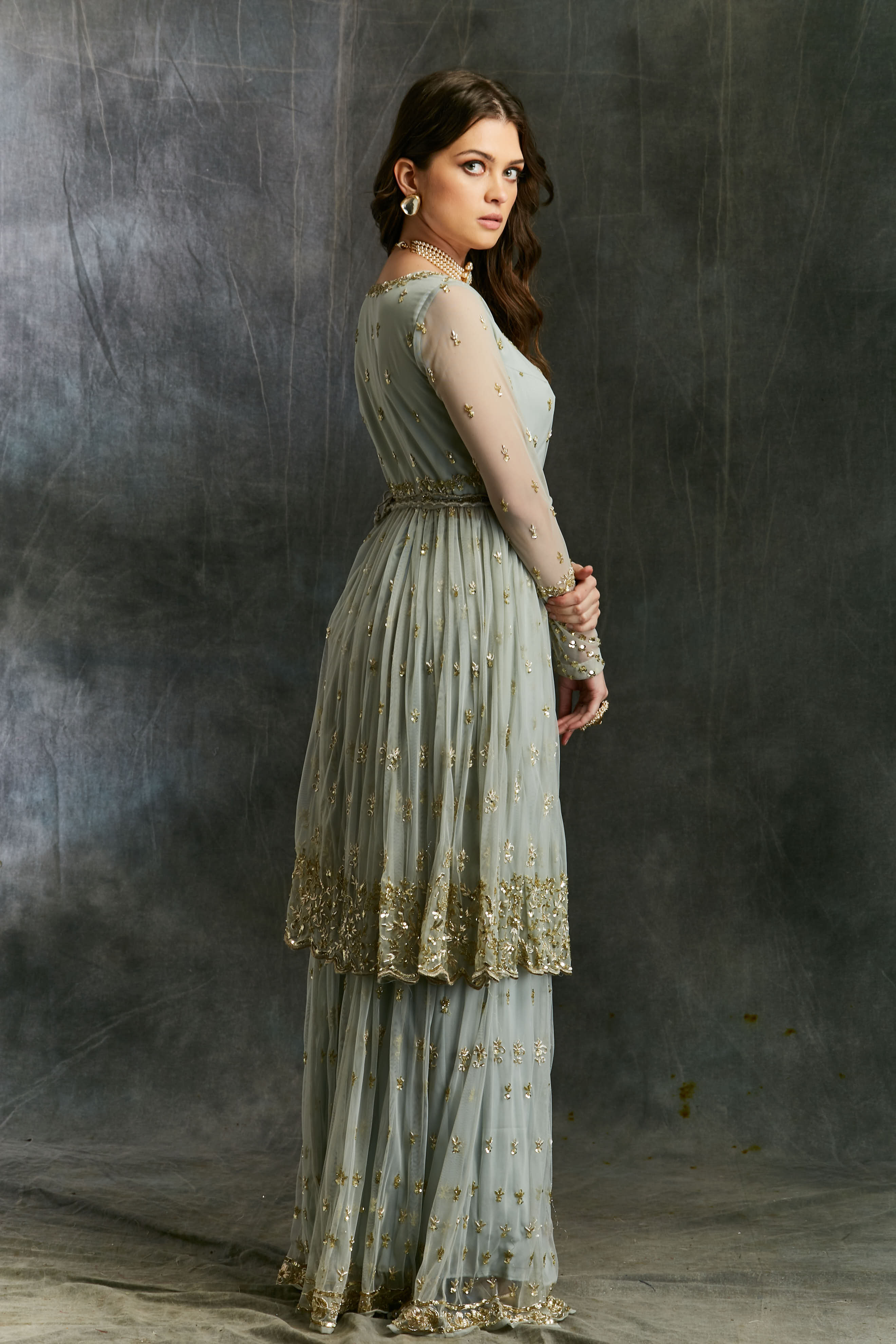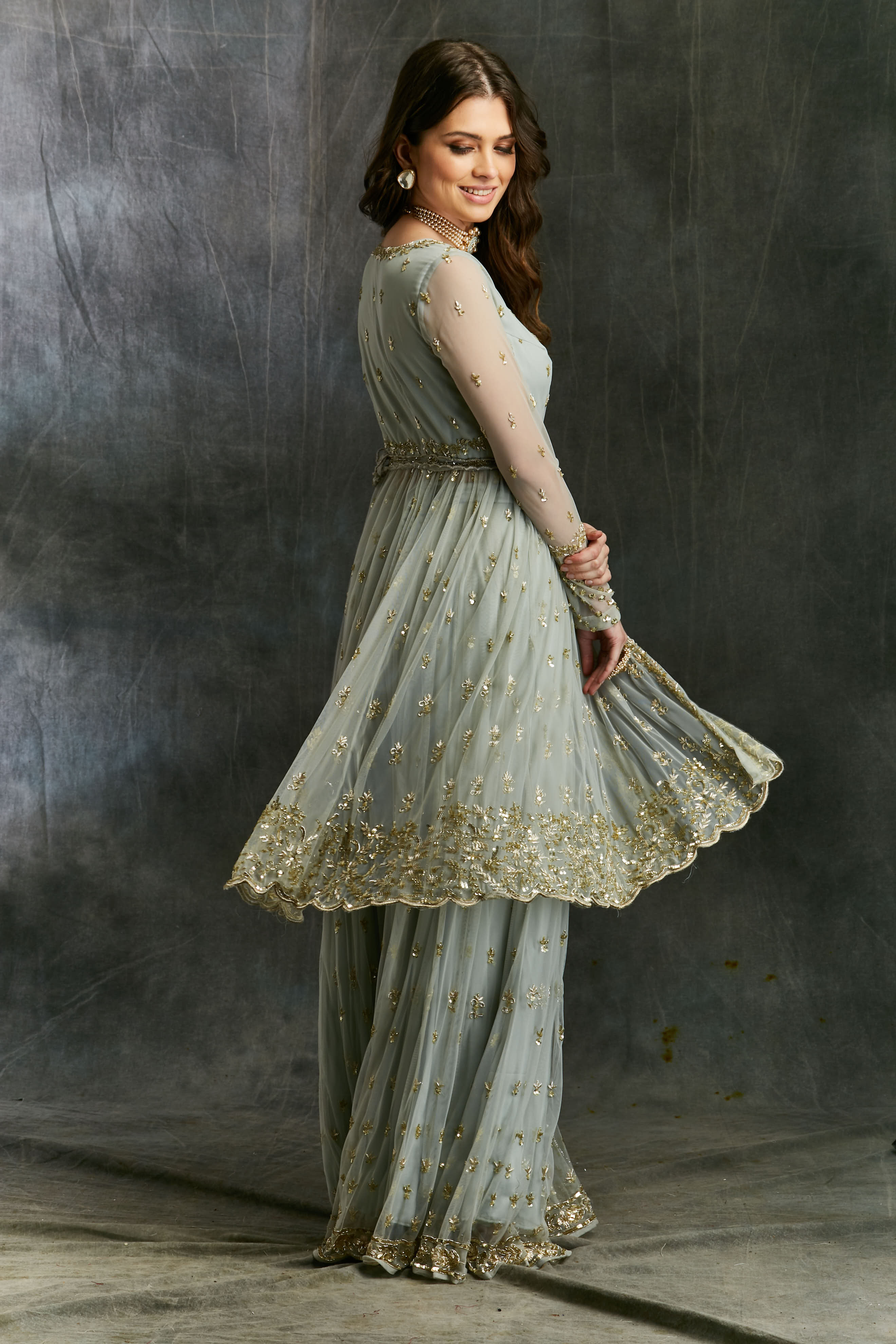 Featuring a SKY BLUE FLARE JACKET WITH SHARARA IN NET.