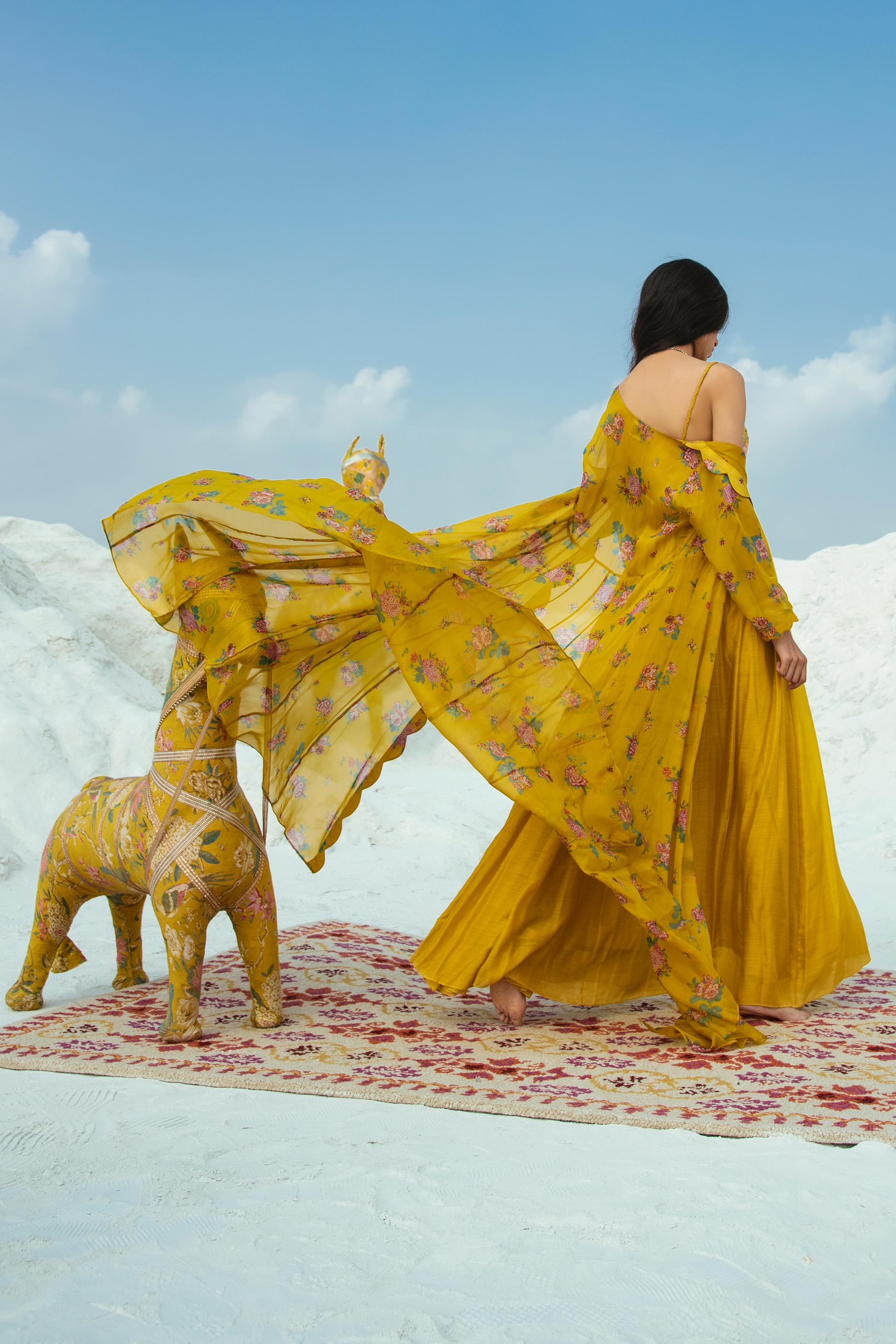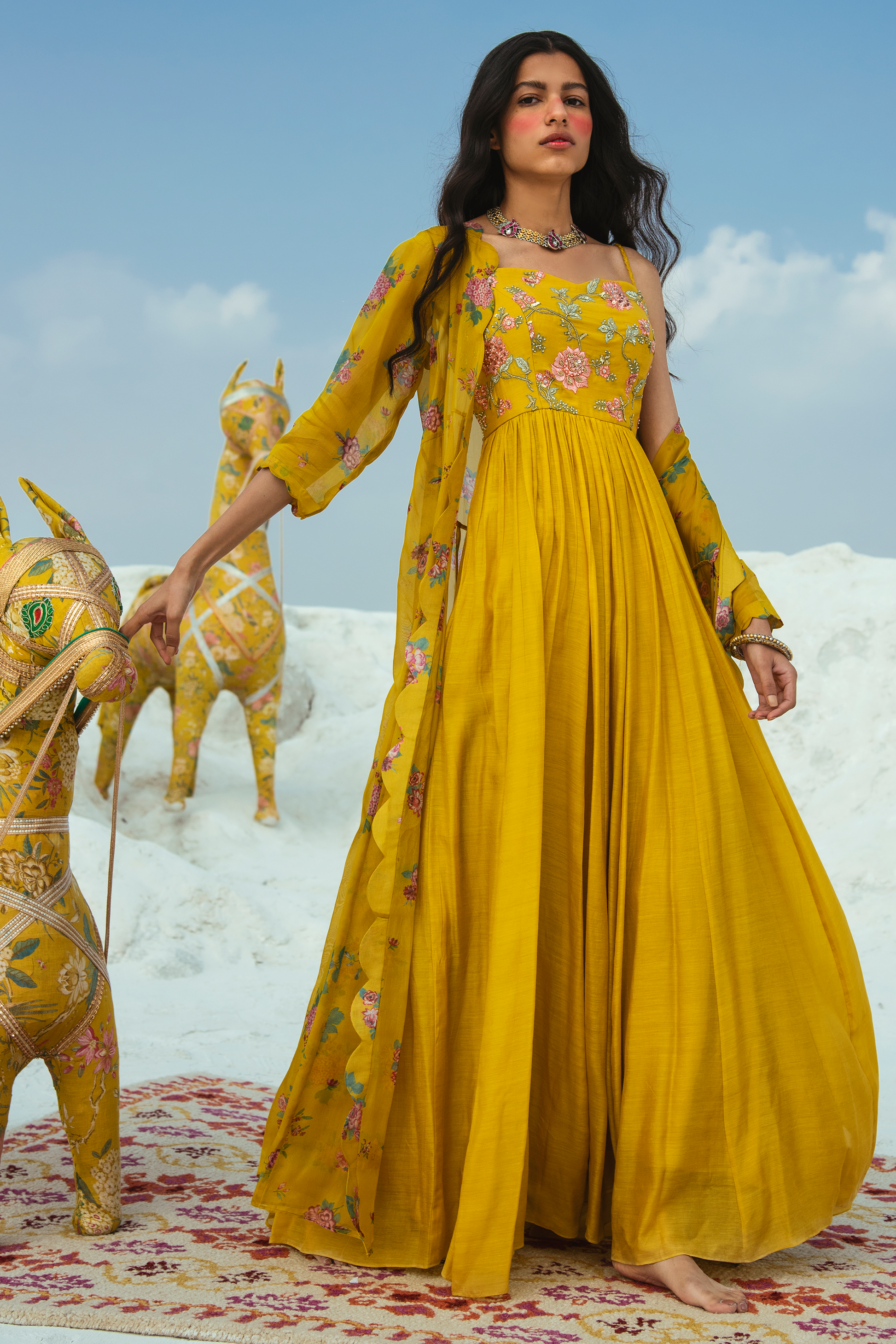A cotton silk mustard maxi with a hand embroidered yoke. It is paired with a floral cheet print scalloped jacket in organza.