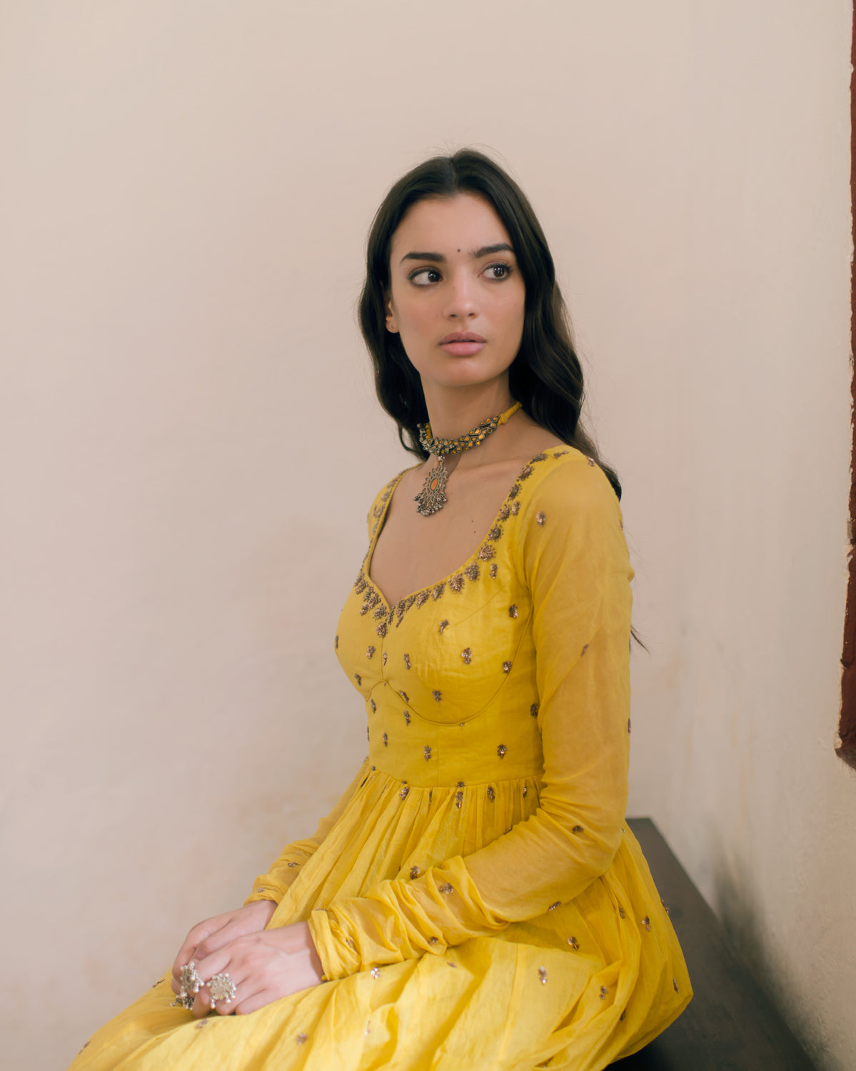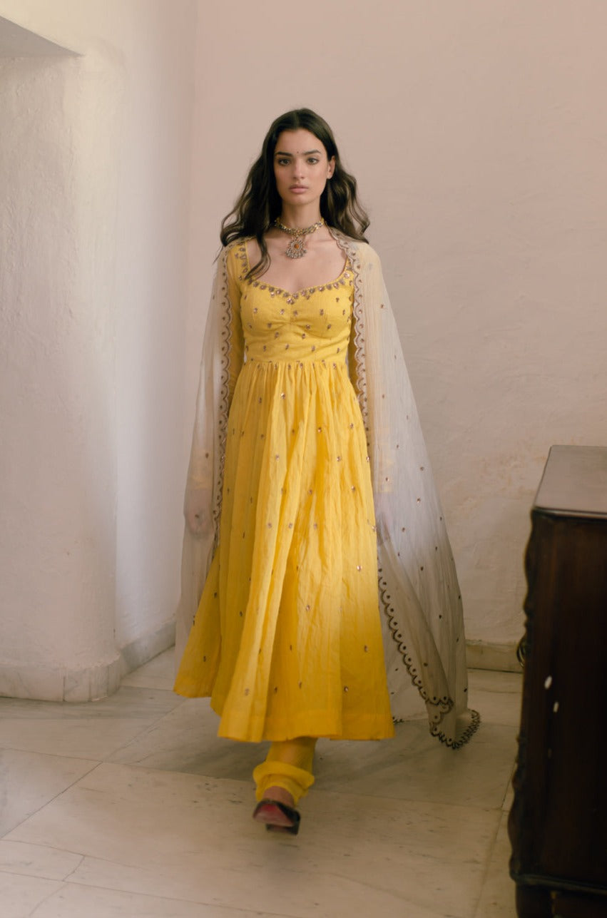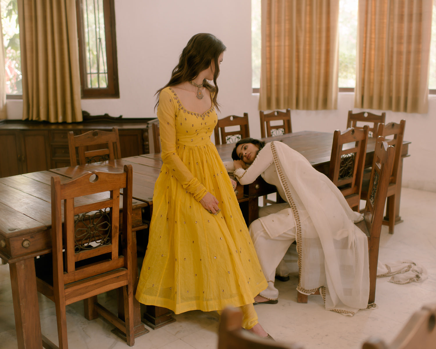 Featuring a YELLOW ANARKALI SET WITH OFF WHITE DUPATTA IN ORGANDY.