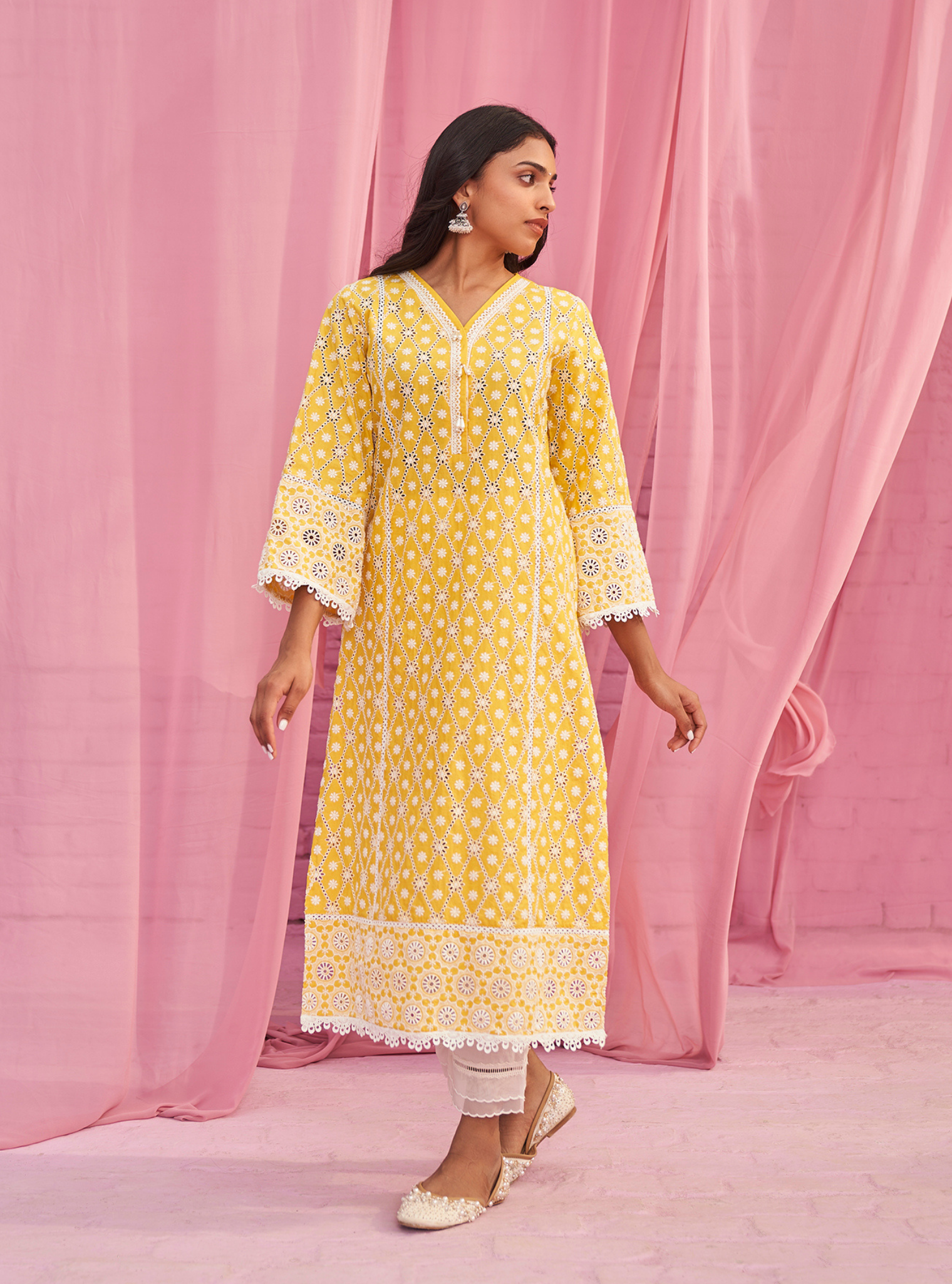 Contact Us For CustomizationA versatile ensemble in vibrant yellow, elevated with delicate cut-work details all over, accentuated with white thread embroidery, that creates a subtle contrast. The kurta features a classy V-neckline; the sleeves and the hemline are adorned with lace trimmings for the quintessential Mulmul touch.