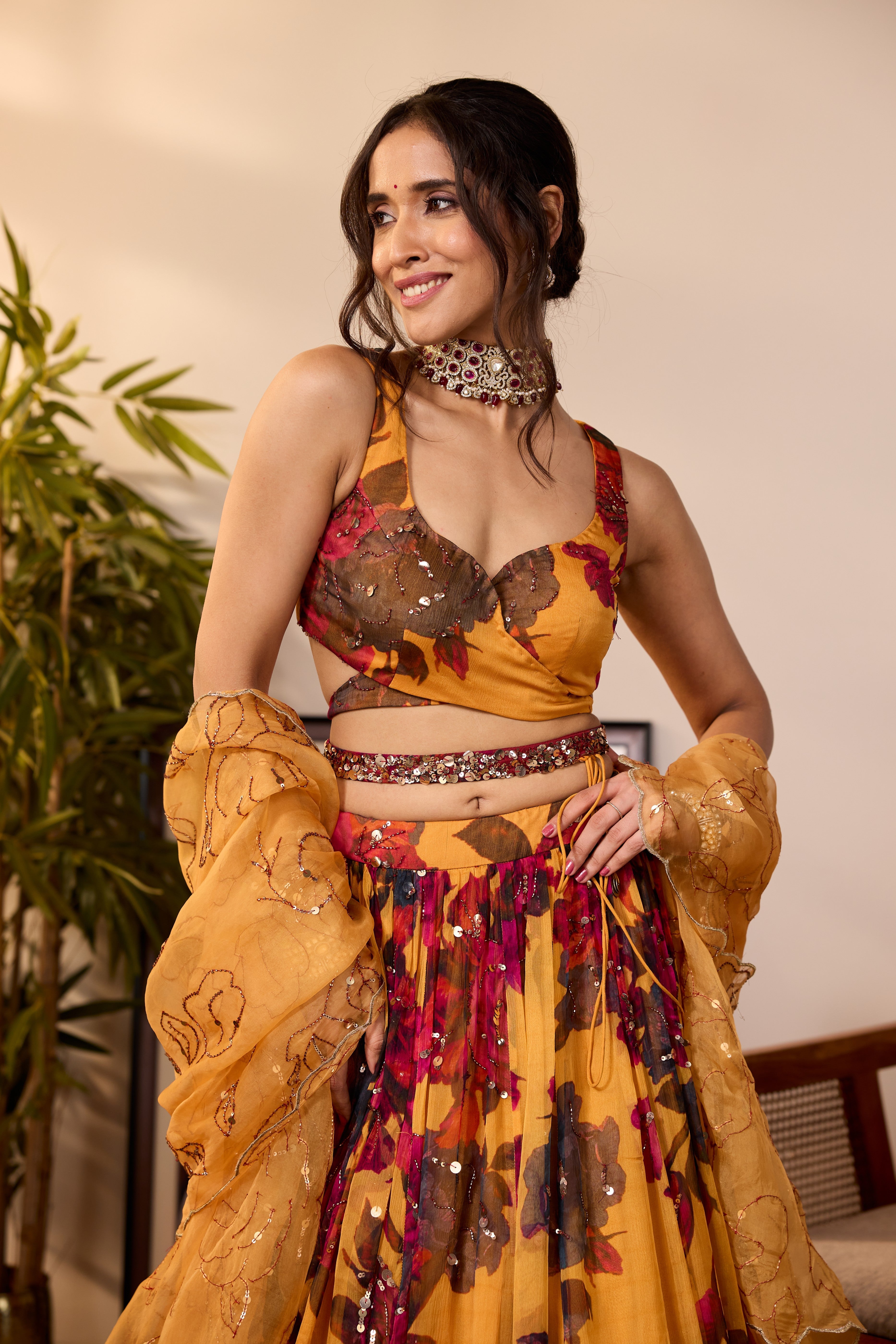 Featuring a Yellow Floral Lehenga in Chiffon.