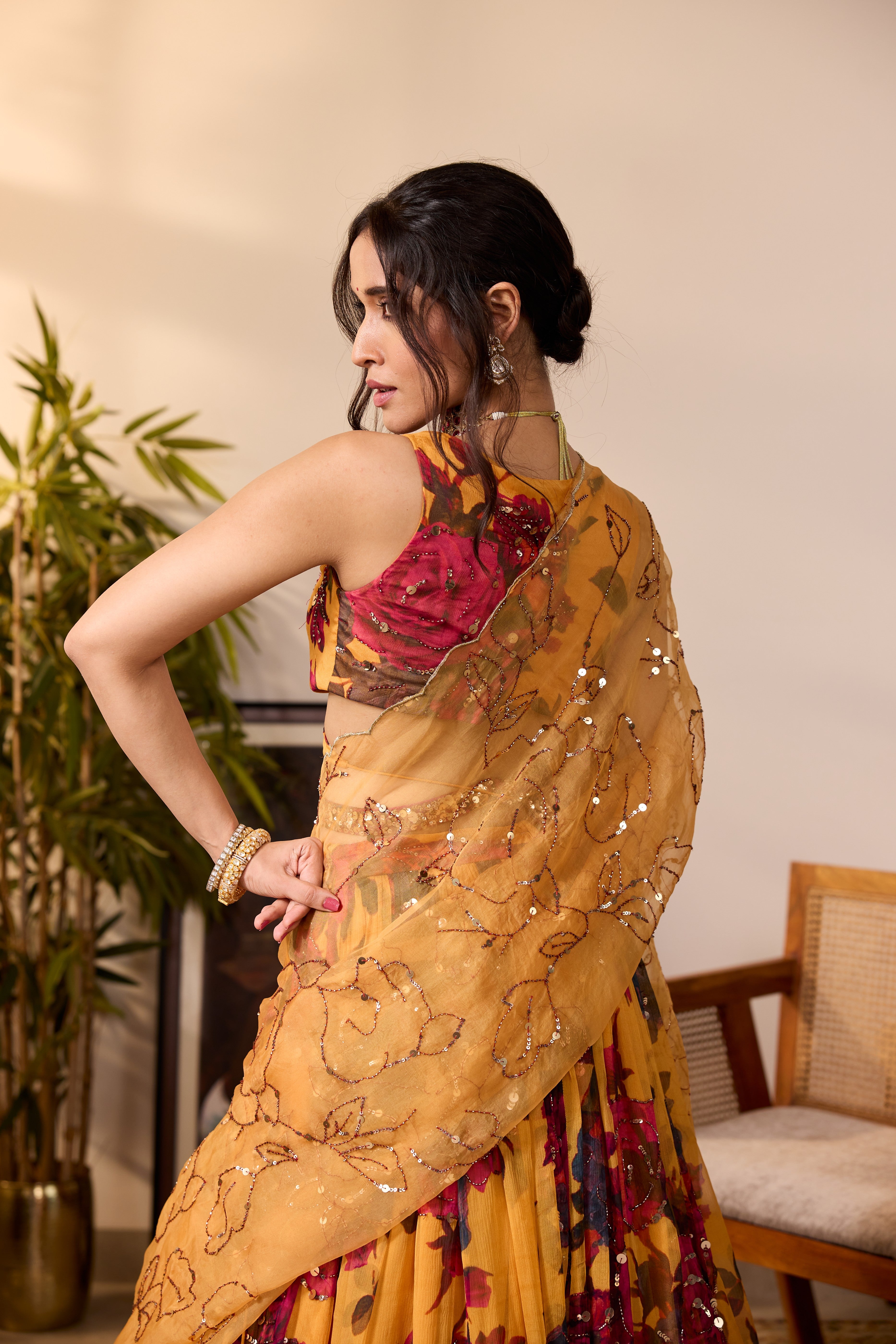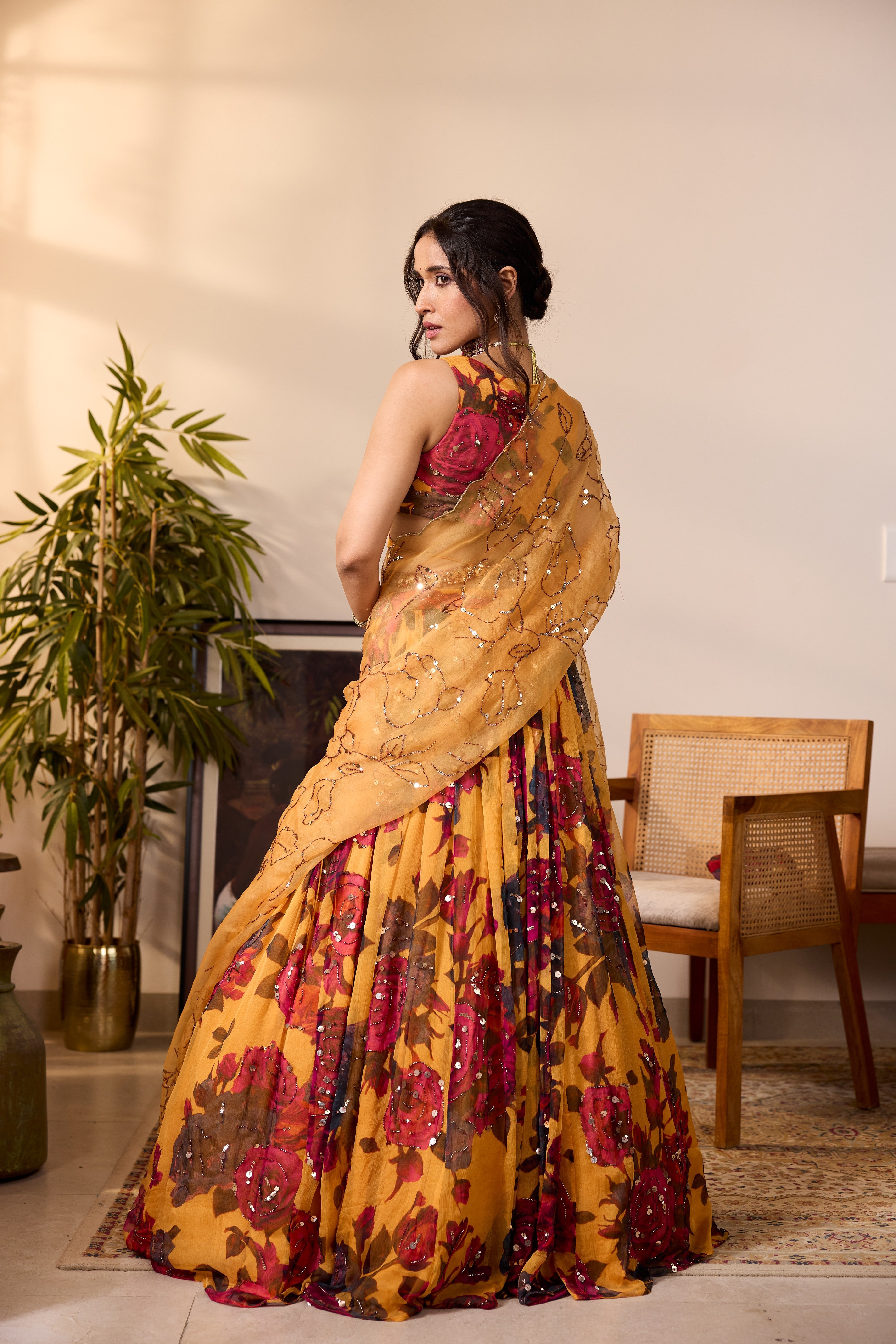 YELLOW CHIFFON FLORAL LEHENGA