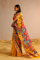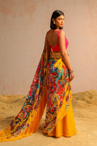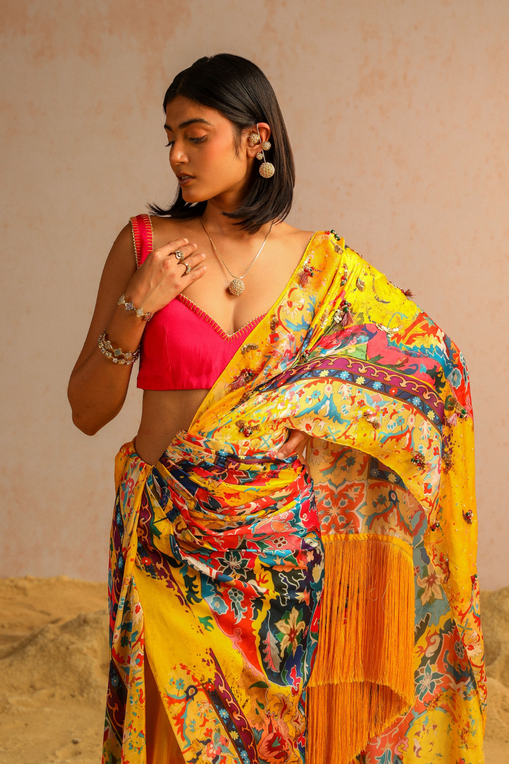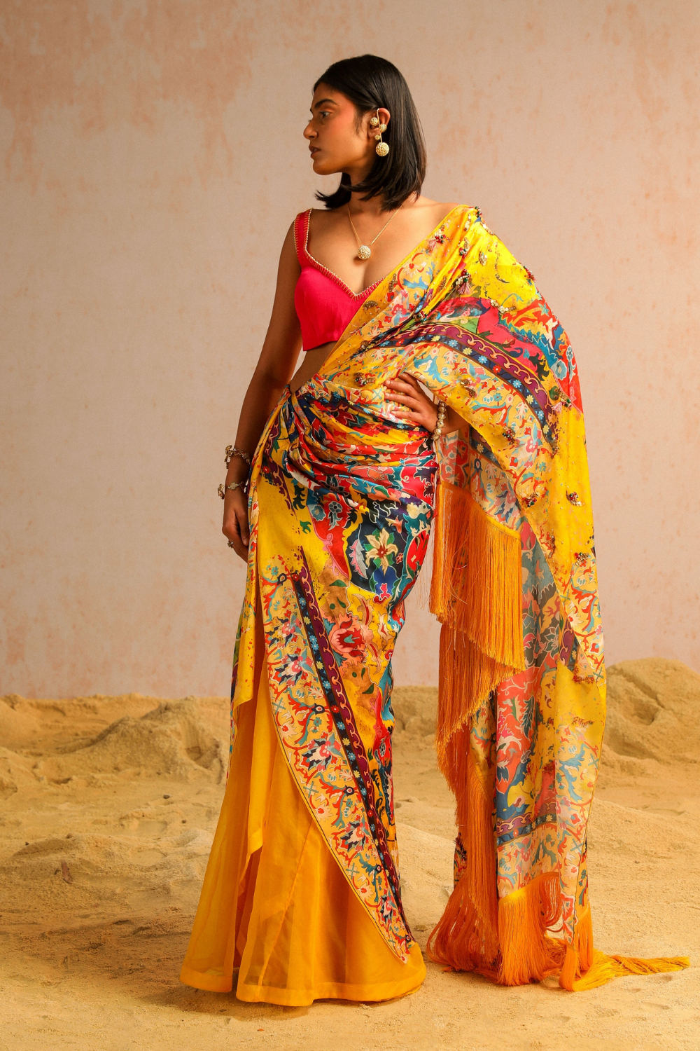 This yellow satin Georgette draped saree embodies our signature draping style. In addition, the saree features an organza layer underneath the drape, gracefully wrapping around the body to create fluid lines and elegant folds, adorned with intricate motif print inspired by Jan Kath's erased carpets. It is complemented by a matching hot pink crepe blouse. The minimalist silhouette accentuates the captivating yellow and pink color combination, while the fabric's delicate sheerness enhances its overall elegance. Vibrant hues, reminiscent of macaw plumage, infuse the ensemble with an exotic allure. The intricate aari and zardozi work, including sequins, pearls, tassels, and thick fringe borders on the dupatta's hem, add movement and artistic charm to the outfit.