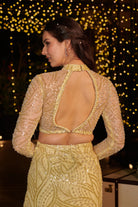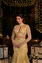 Radiate timeless elegance in this Butter Yellow mermaid lehenga and high-neck blouse set. Crafted from luxurious net fabric, the outfit features a stunning lehenga skirt that contours the body and flares gracefully, creating a captivating silhouette. The high-neck blouse with full sleeves enhances the ensemble with a sophisticated touch. Adorned with exquisite embellishments of matching pearls, sequins, silver kutdana, and intricate thread work, this outfit exudes refined glamour. The delicate, tonal embroidery adds a layer of texture and sparkle, making it perfect for upscale events and weddings.