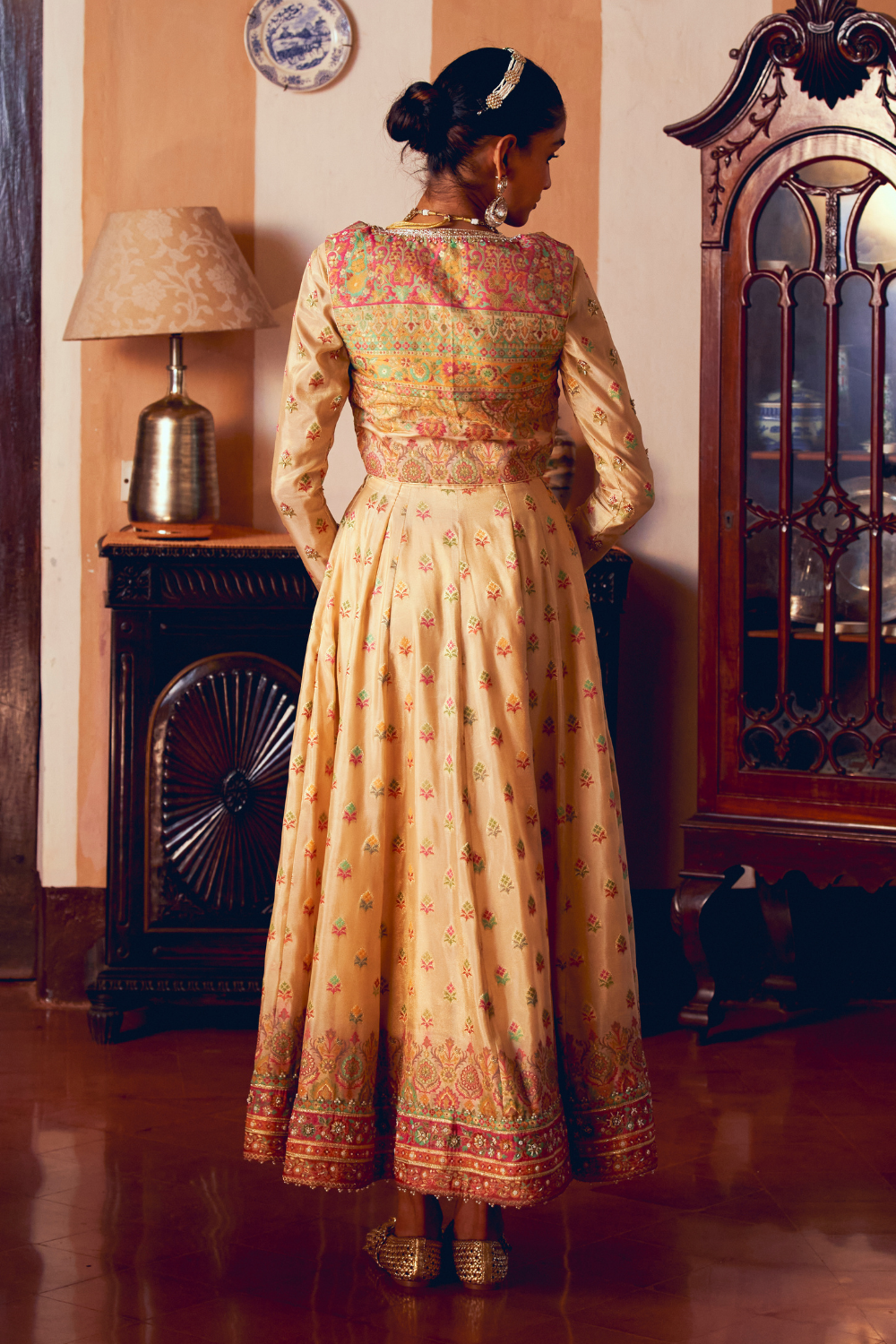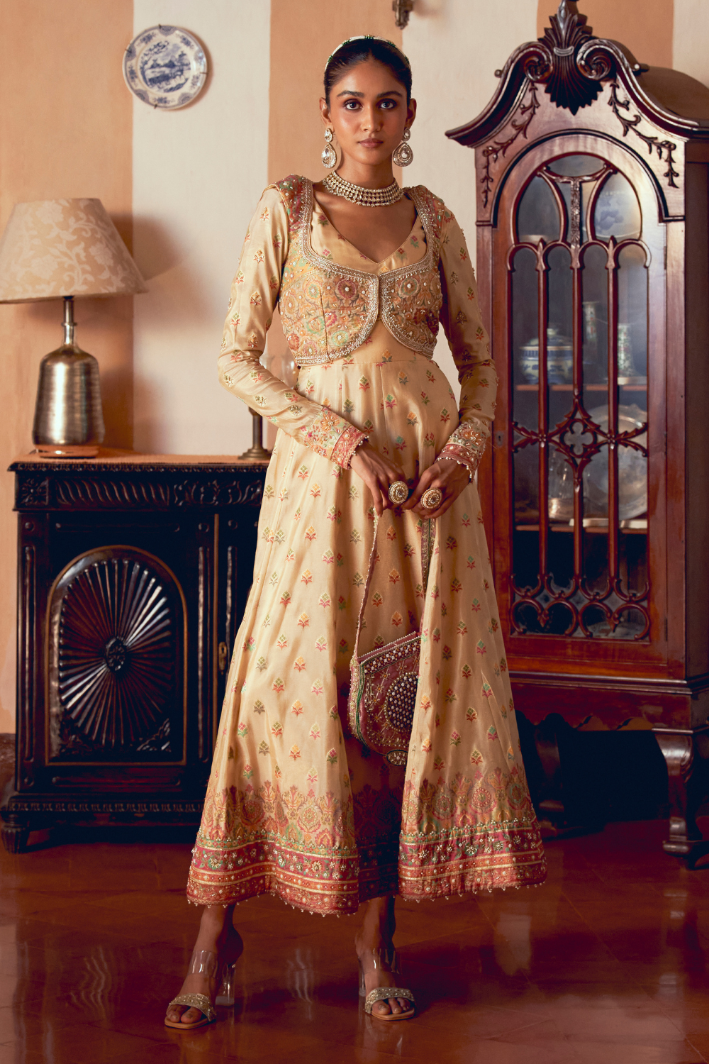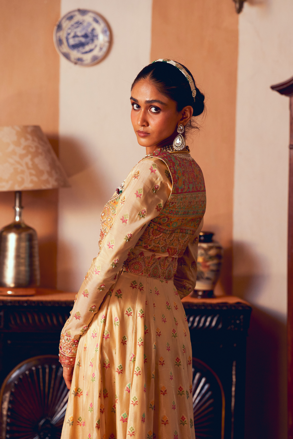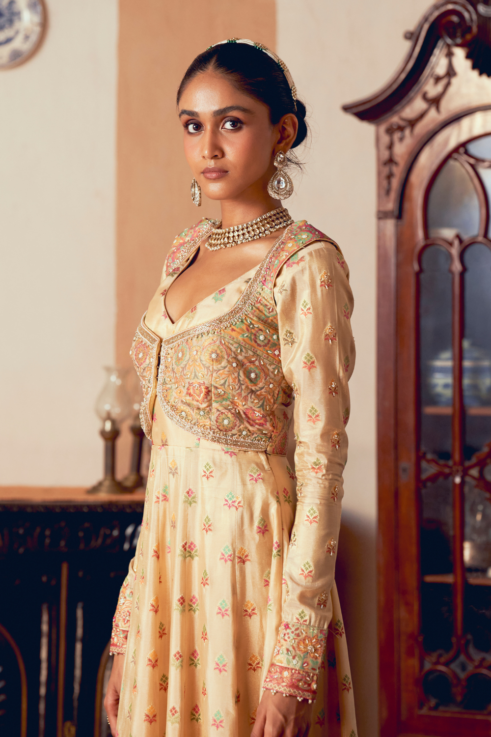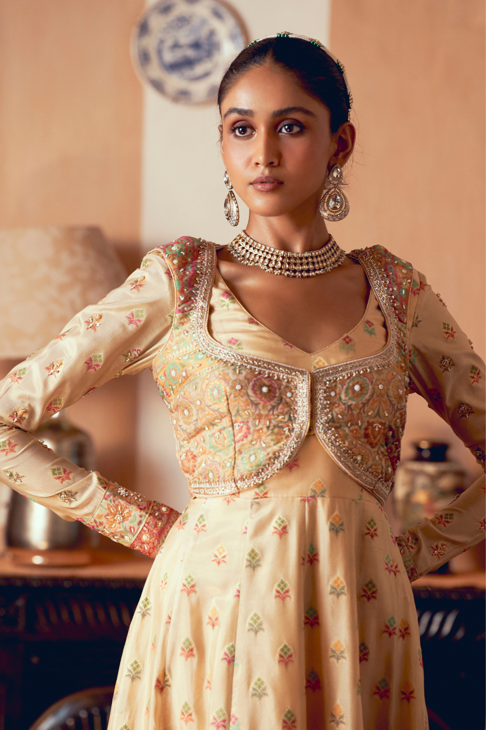 This Kalidar Anarkali set in pastel yellow Jacquard silk Banarasi features intricate zari and zardozi embroidery. The ensemble is completed with a cropped jacket.