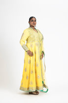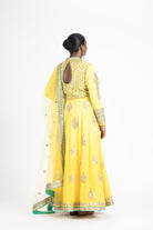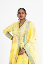 Yellow Ombre-Dyed Kalidar Georgette Jacket, Net Dupatta, And Palazzo Embroidered With Gota, Mirrors, And Turquoise Resham.