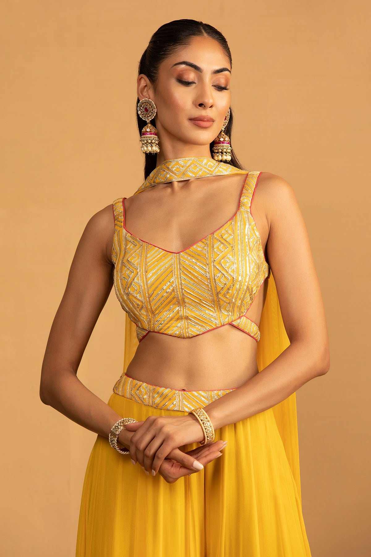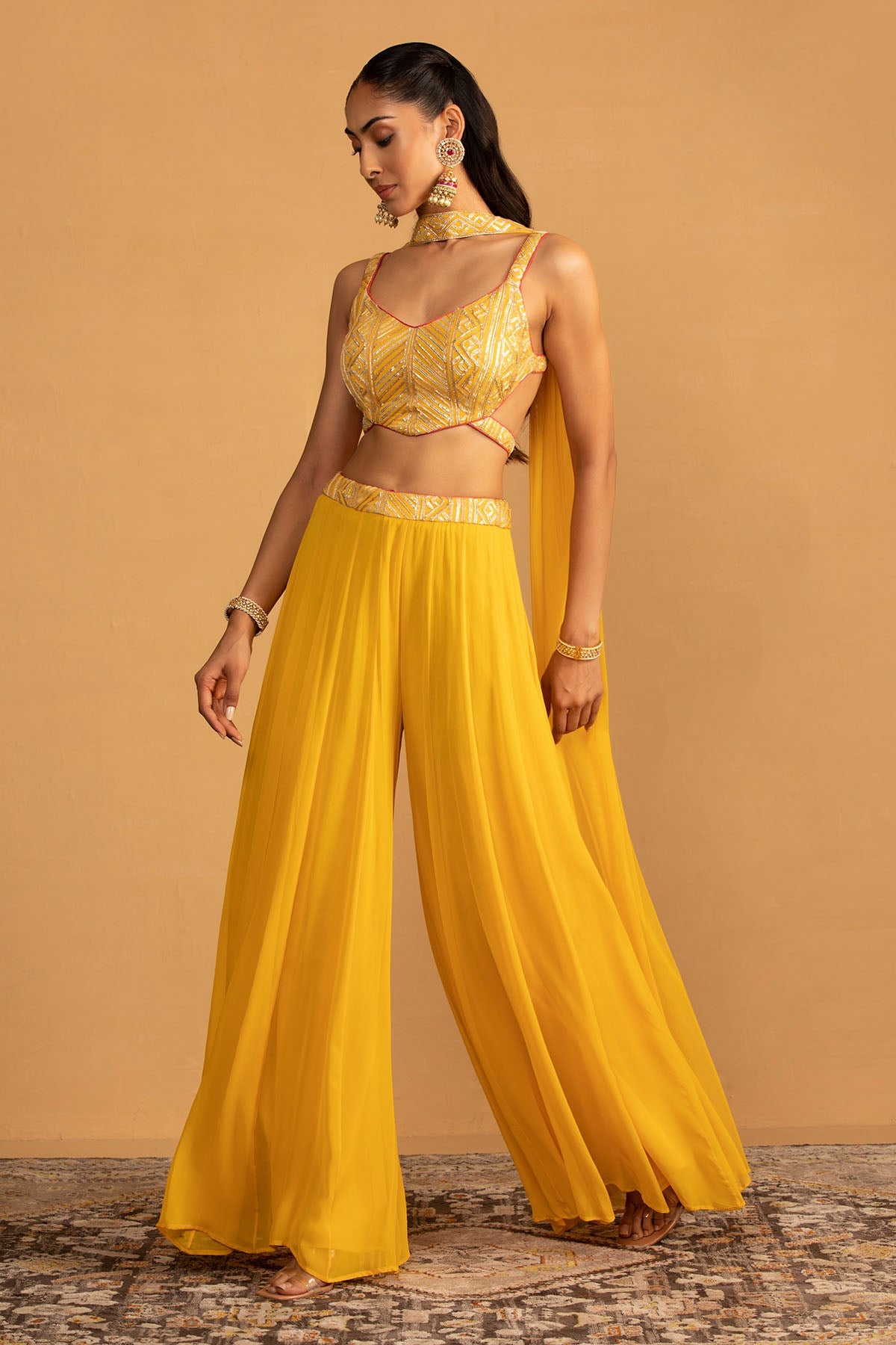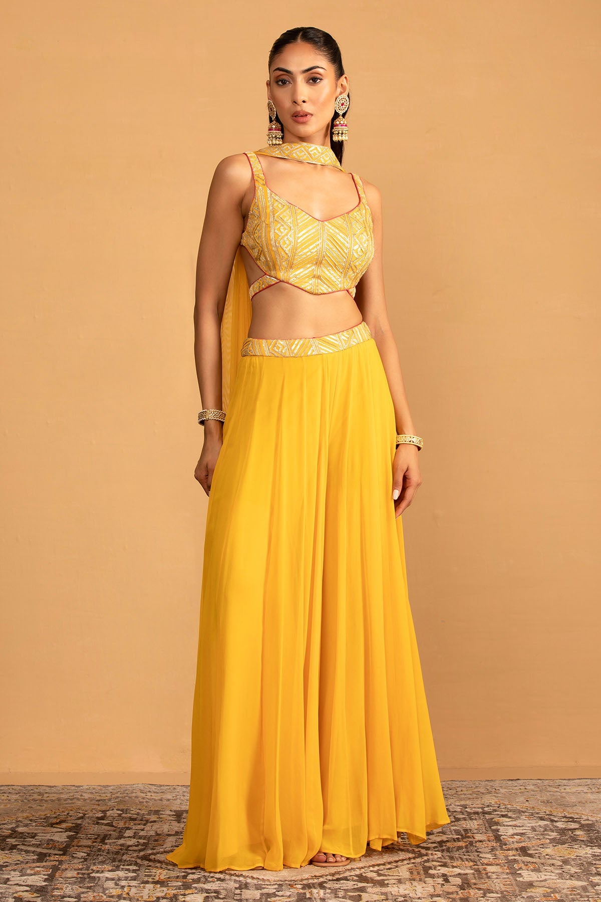 CONSIST OF YELLOW GOTA WORK TOP ON GEORGETTE FABRIC WITH GEORGETTE PALAZZO AND NET DUPATTA