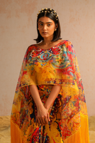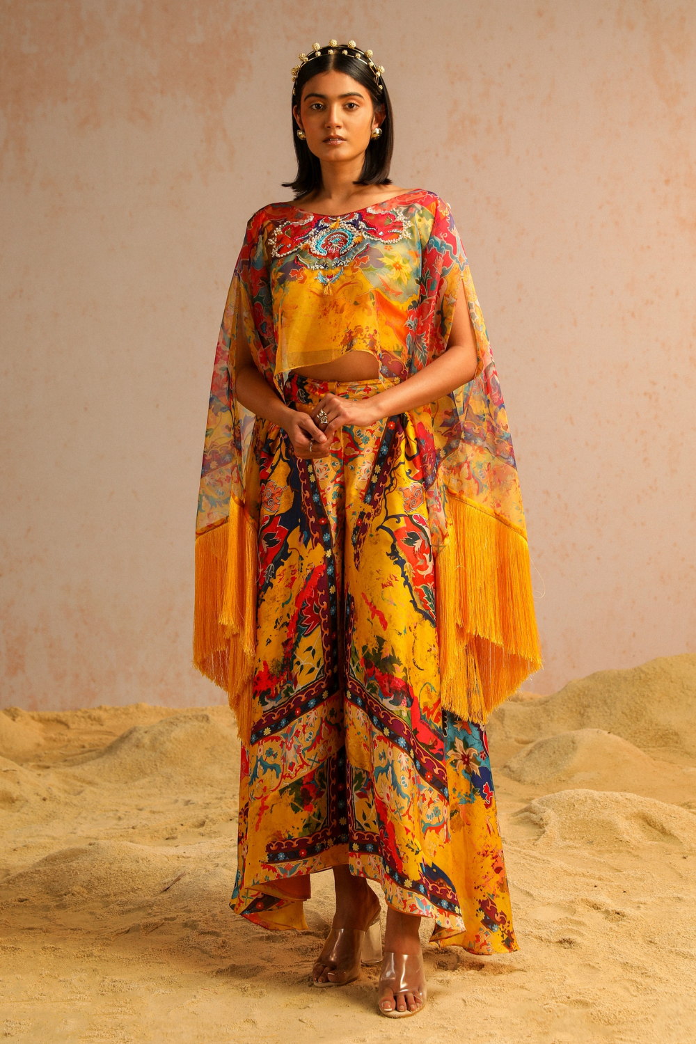 The silhouette of this ensemble showcases the relaxed fit of yellow satin Georgette A-line pants, adorned with intricate motif print inspired by Jan Kath's erased carpets. These pants are paired with a matching crepe blouse and a printed organza cape, adding layers to the silhouette that enhances its depth and dimension. The delicate sheerness of the fabric adds to the overall elegance of the outfit. Vibrant hues, reminiscent of macaw plumage, give it an exotic allure. The ensemble is further elevated by highlighting the cape's front neckline with delicate aari and zardozi work using sequins and pearls, along with tassels and thick fringe borders on the cape's sleeves, creating movement and an artistic feel.