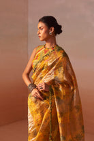 Yellow mustard multi colour tissue organza saree enhanced with a designer applique blouse with multi colour stonework.