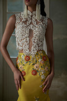 Yellow silk fishtailed skirt paired with an ivory corsetted blouse with floral embroidery in resham accentuated with pearls, beads, sequins and crystals.