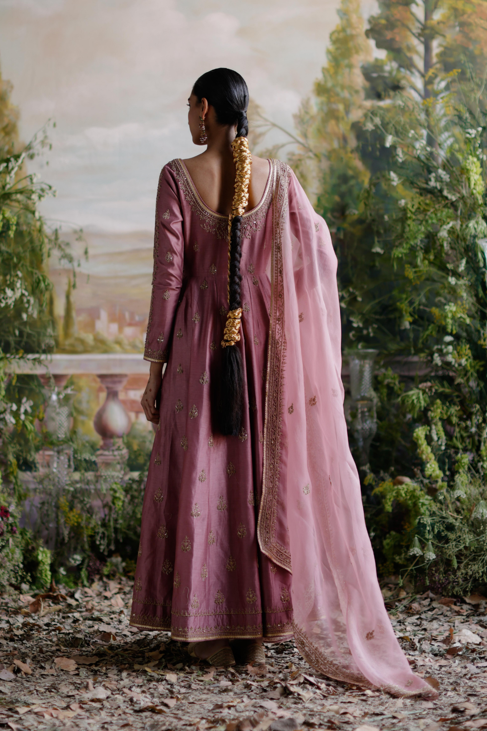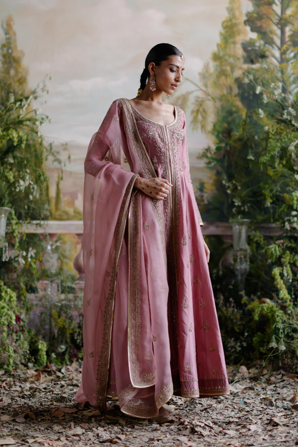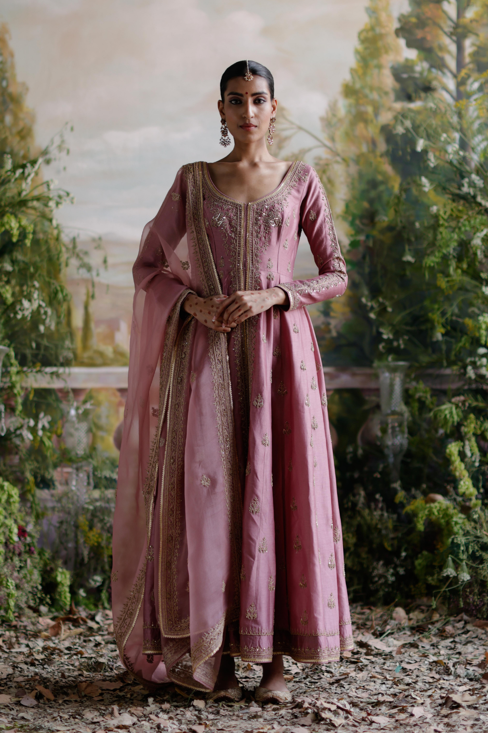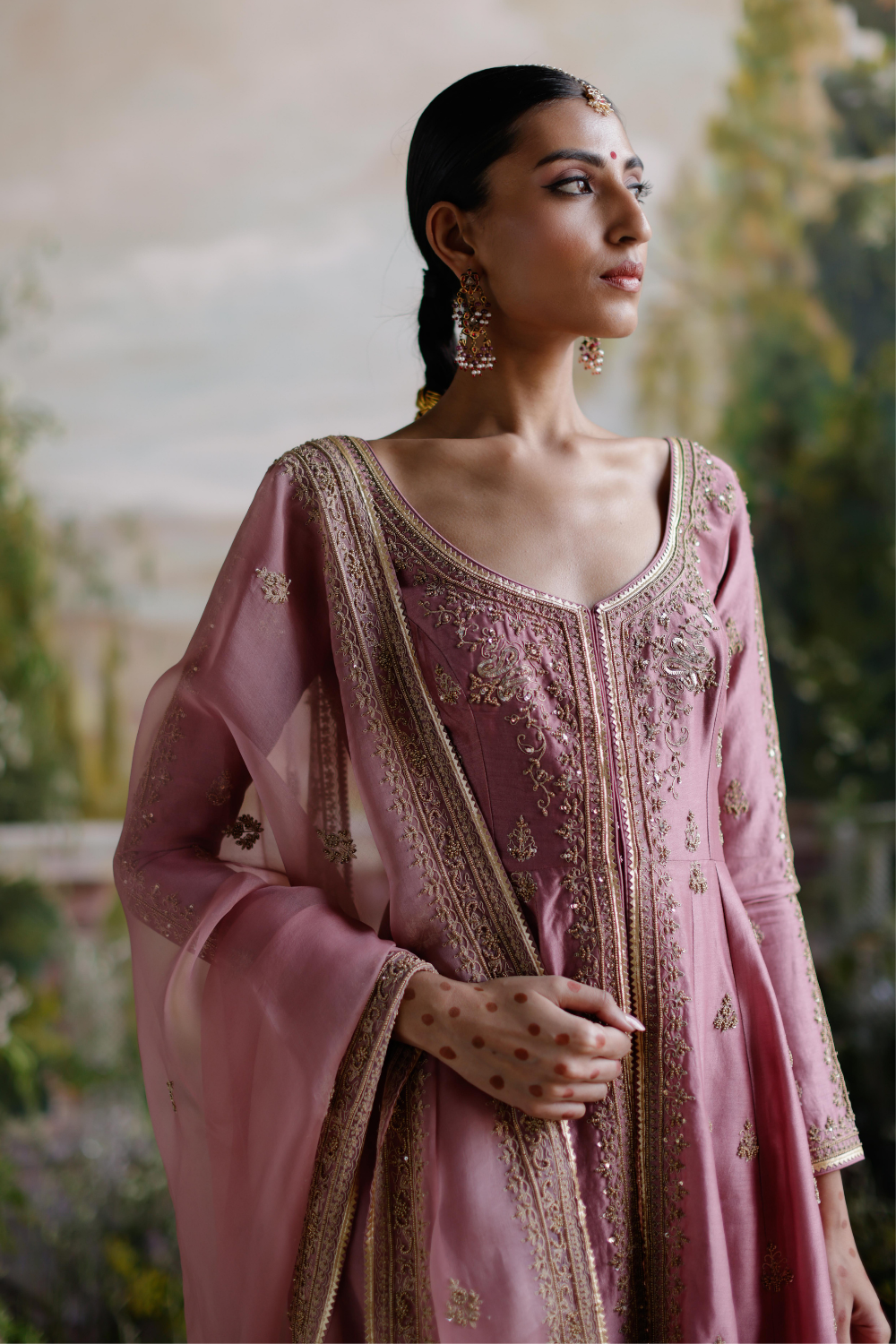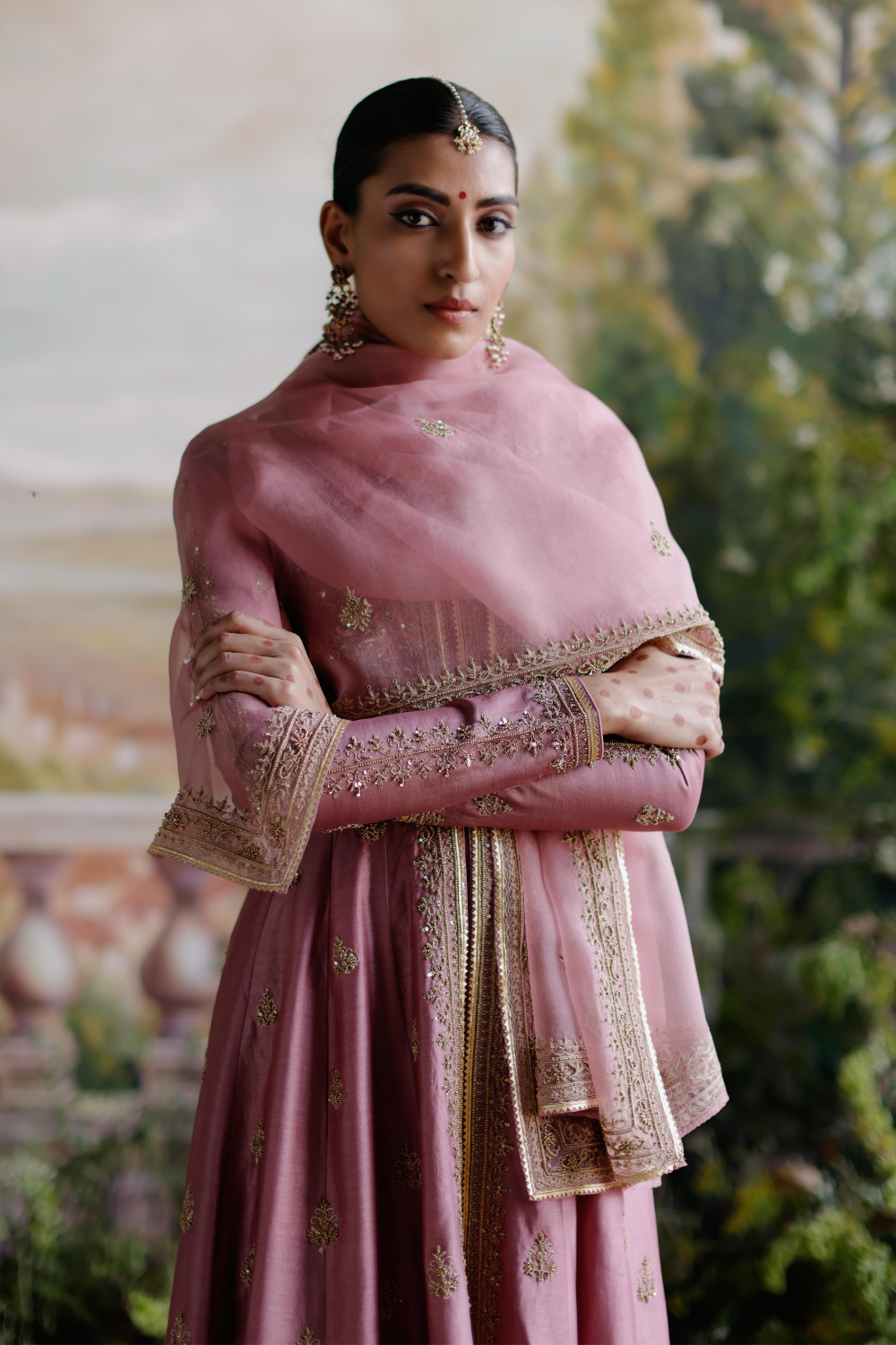 Featuring a lilac chanderi jacket set paired with an organza base dupatta with antique gold dori and aari embroidery.