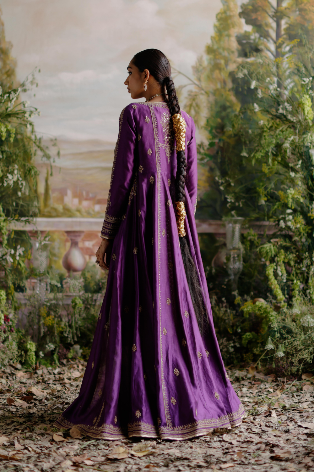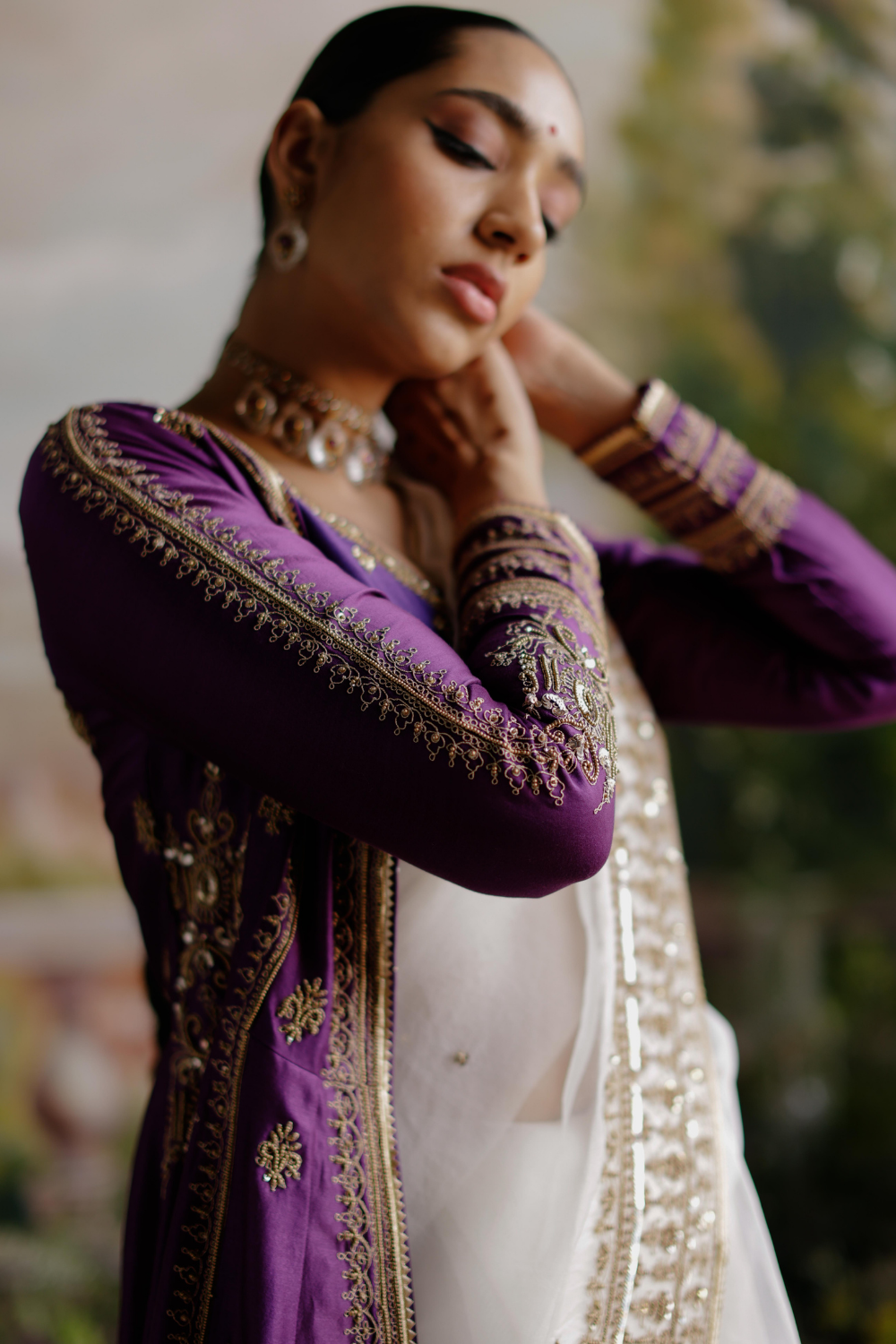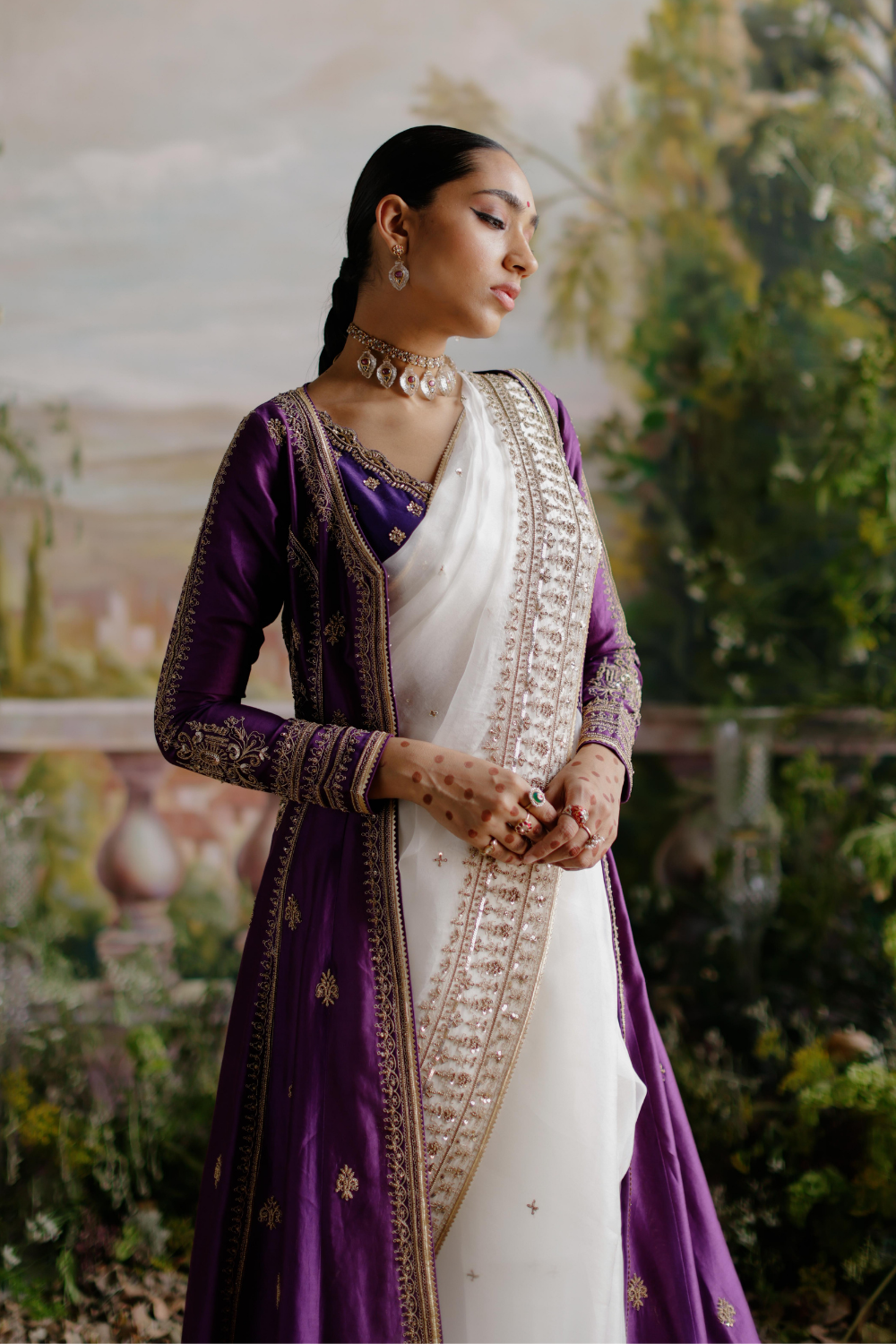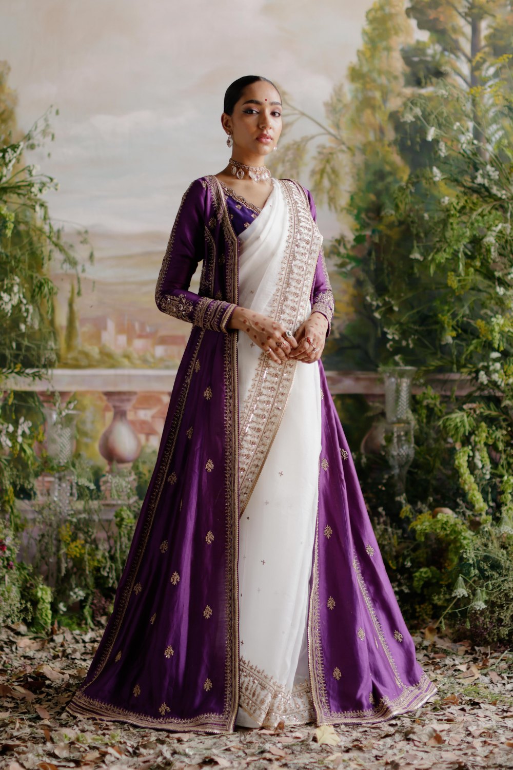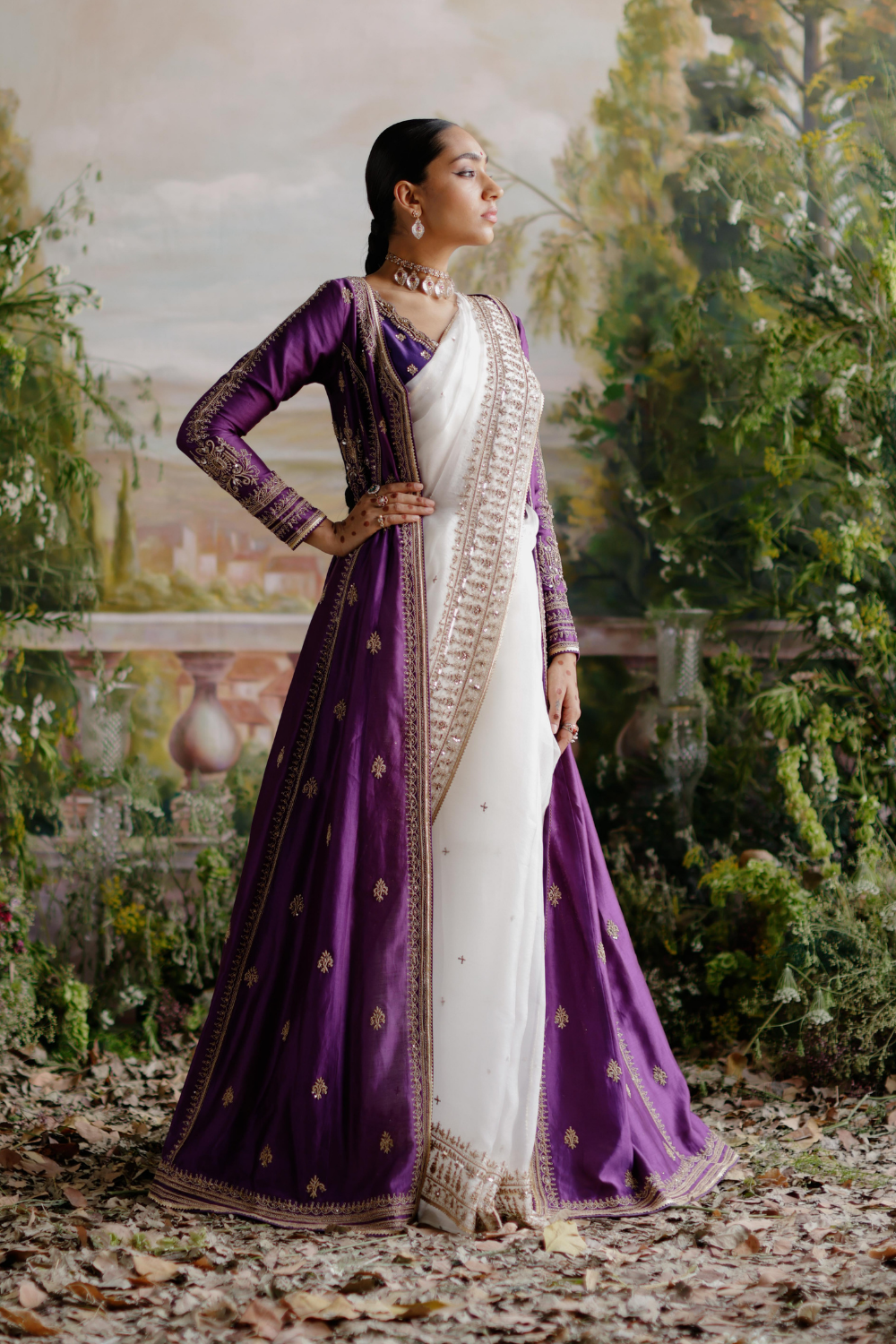 Featuring a purple chanderi jacket paired with an off-white organza saree with antique gold dori, aari and embellished handwork.