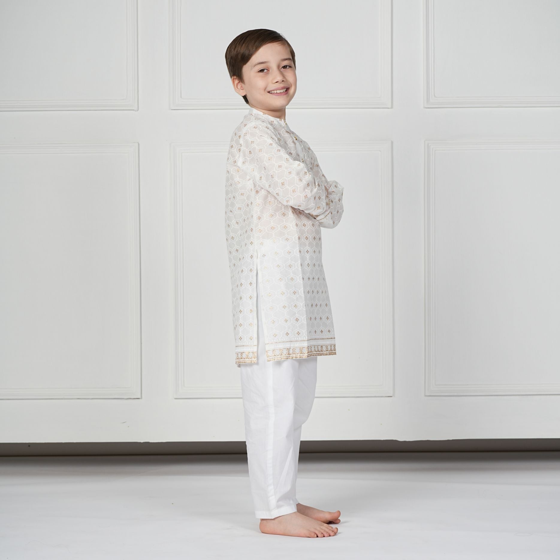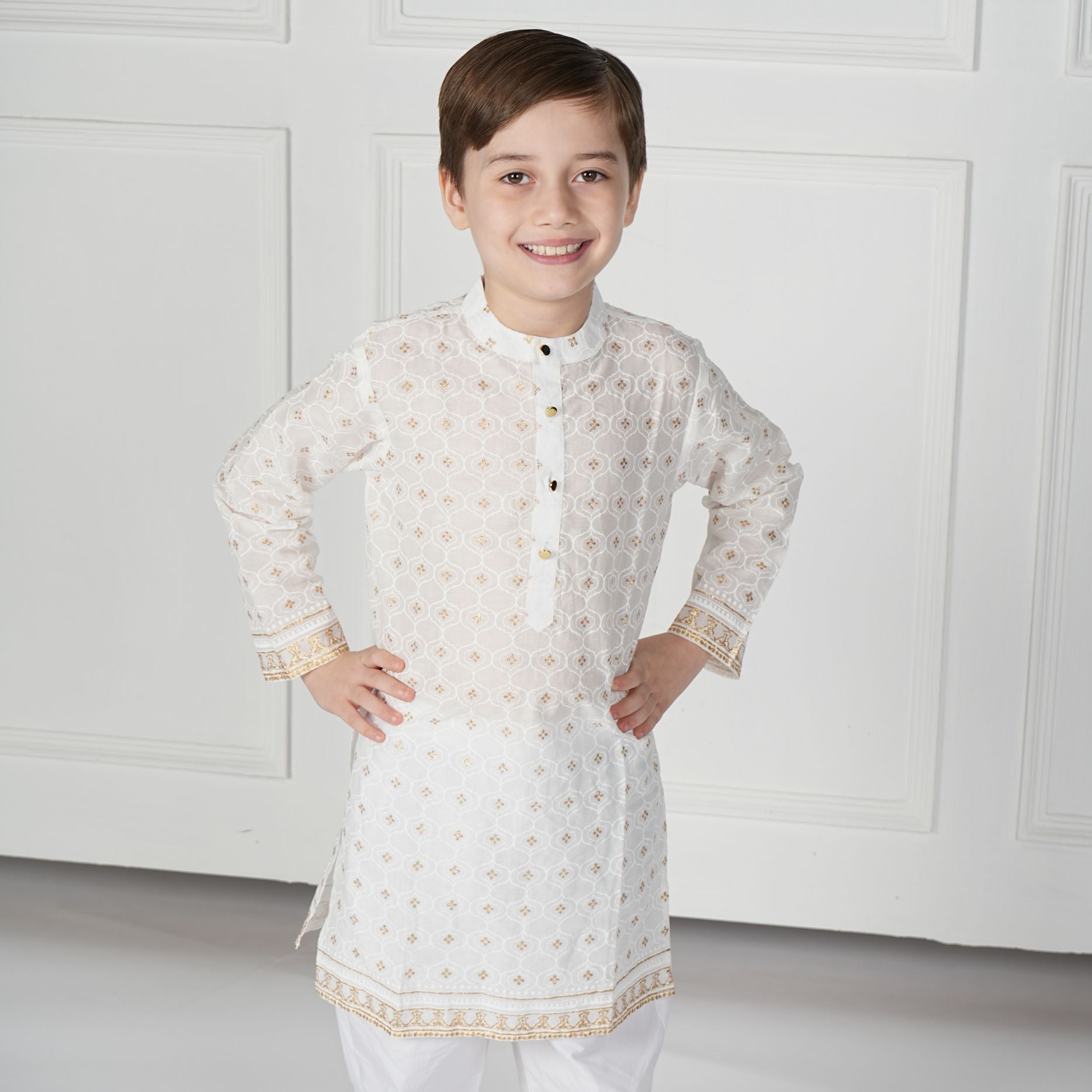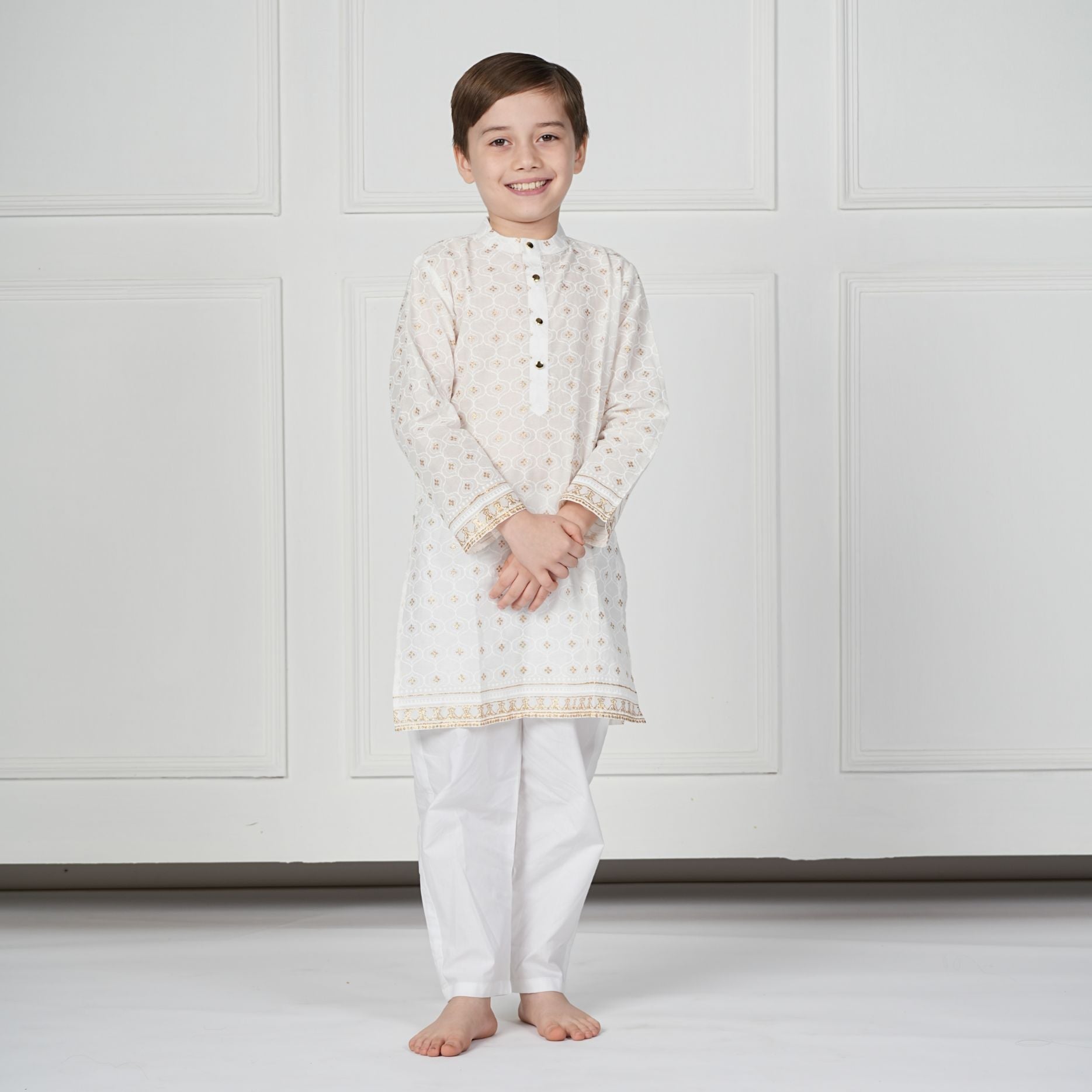 Zayn from Noora 3.0 is a soothing gold foil printed cotton white kurta pyjama set embellished with golden buttons signifies a peaceful charm for your little boy to enjoy this festive season.