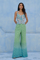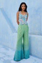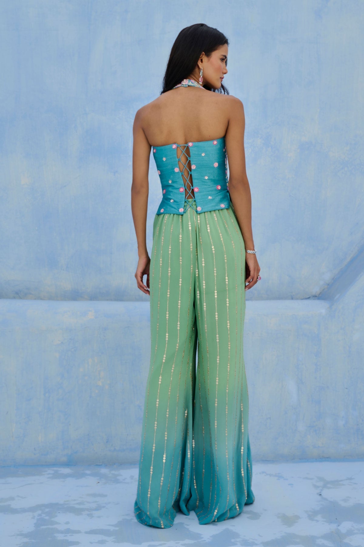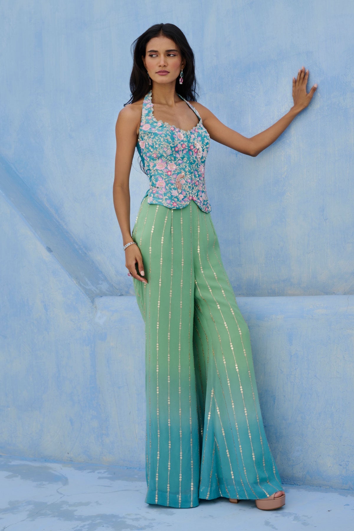 Ombre sequence embellished flared pant paired with colorful threads, glassbeads , sequence and zari embroidered halter neck top.