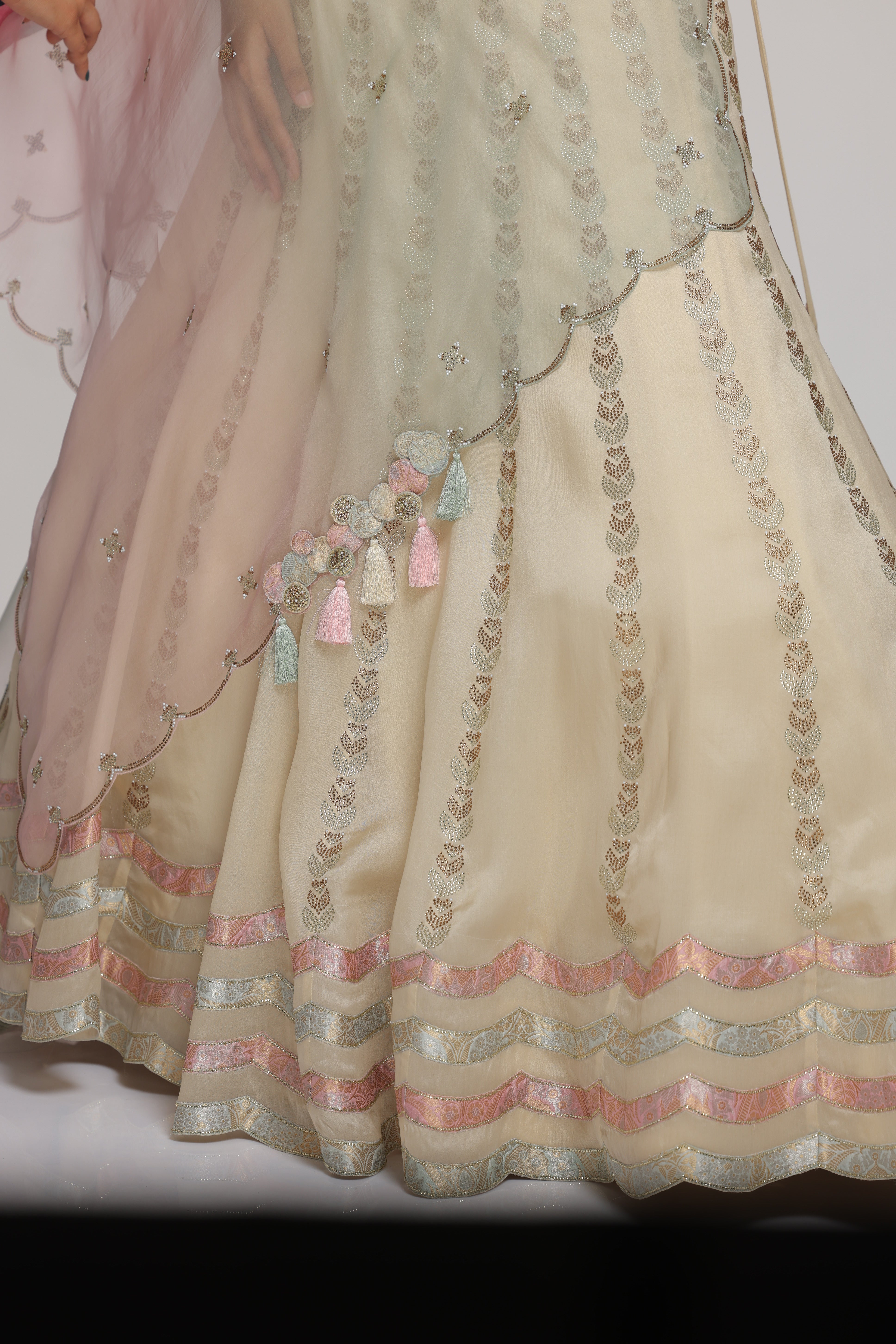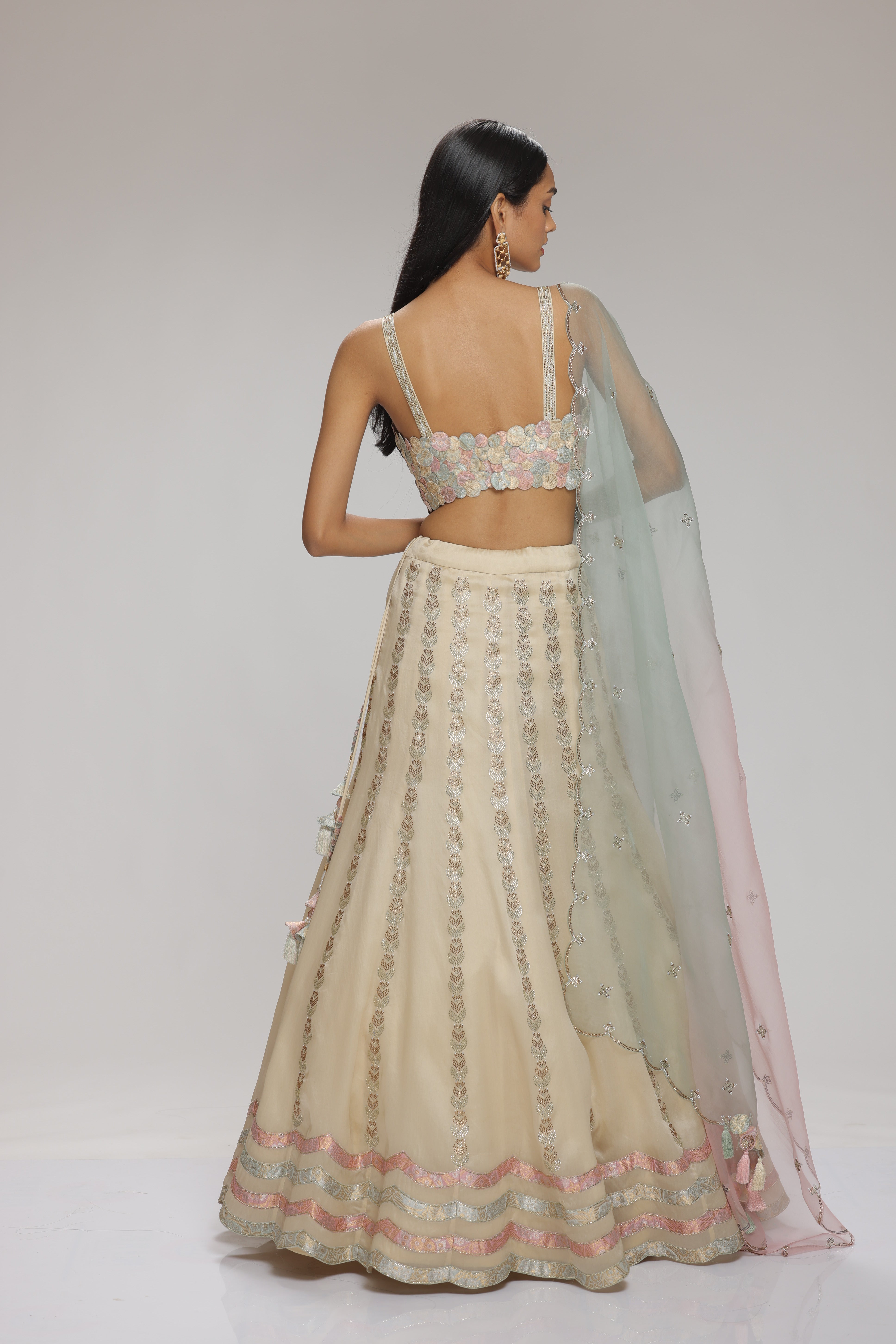 A cream organza lehenga, embellished with delicate rhinestones and featuring a brocade scallop design at the hem, elegantly paired with a brocade blouse detailed with intricate brocade applique. Completing the look with an ombre organza dupatta, embellished with glistening rhinestones.