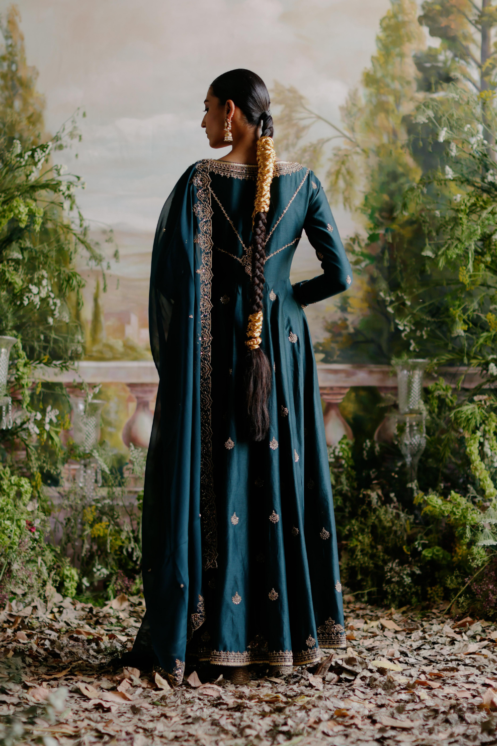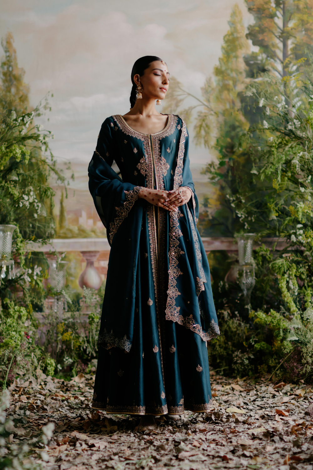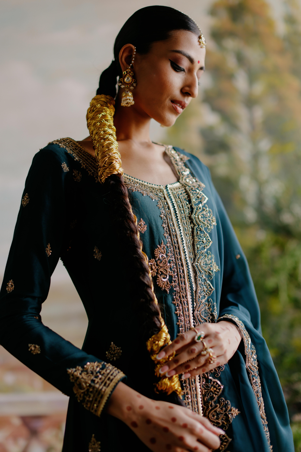 Featuring a dark green Chanderi jacket set paired with an organza base dupatta with antique gold dori and embellished hand embroidery.