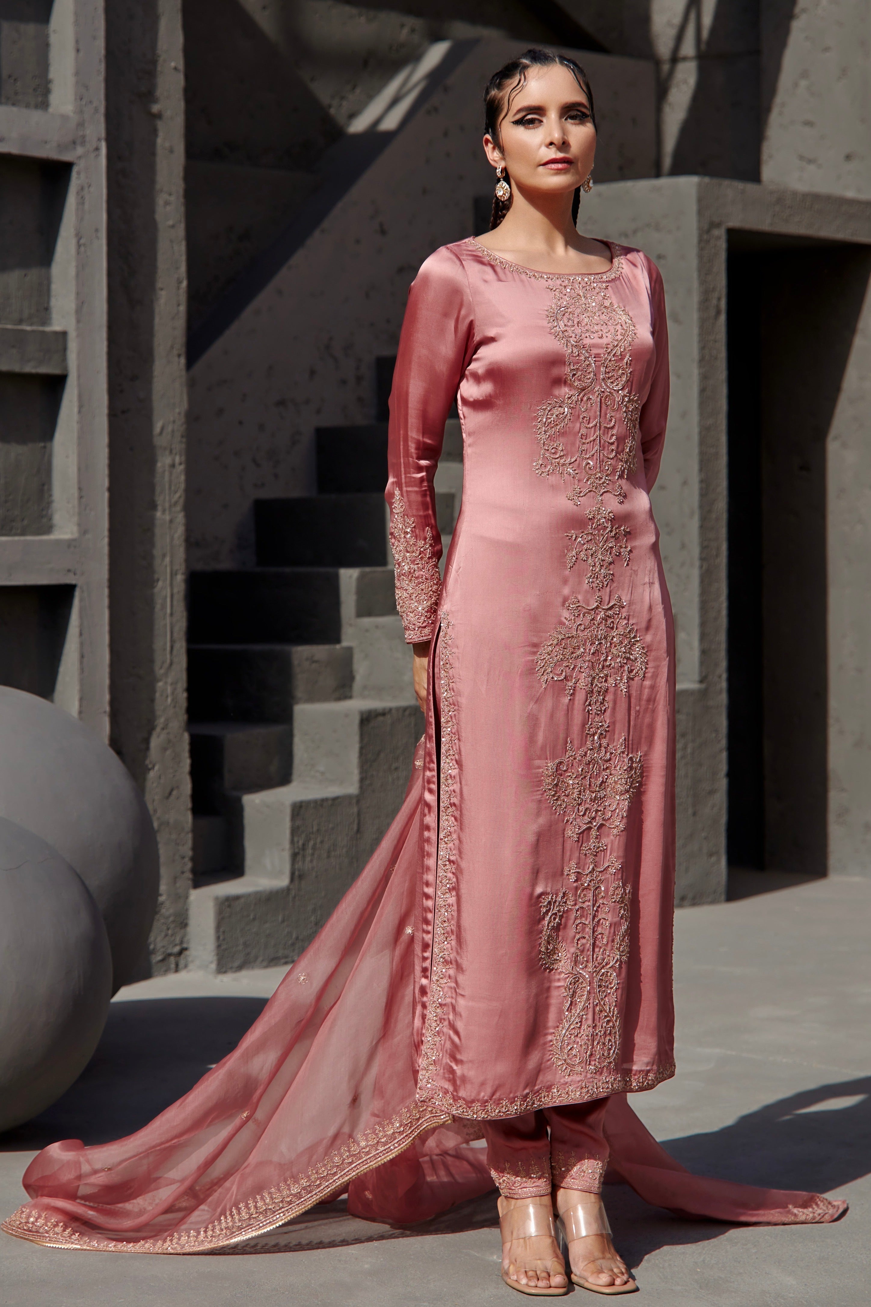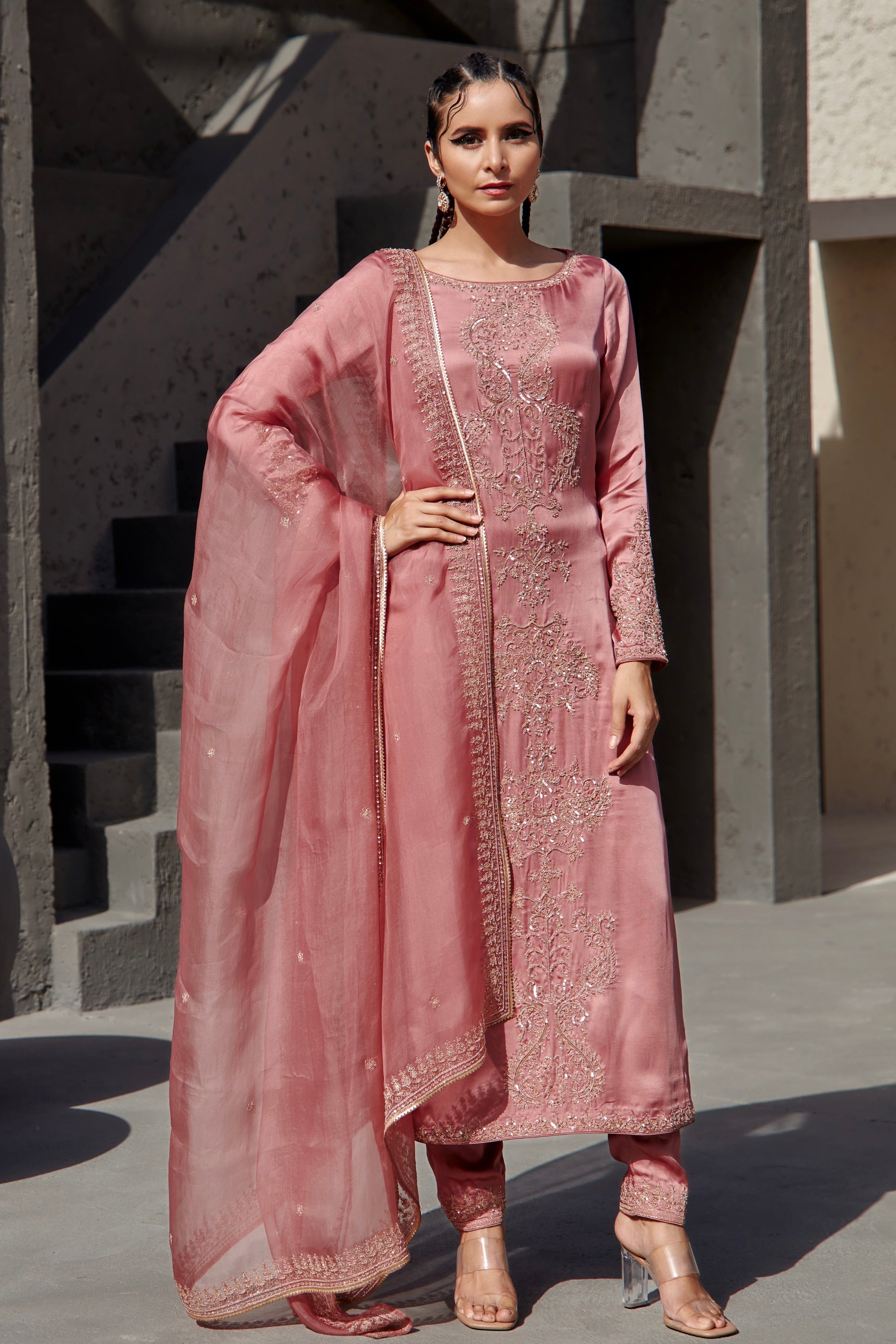 Featuring an aurora pink Dupian silk straight suit pant set paired with an organza dupatta with gold dori and aari embroidery